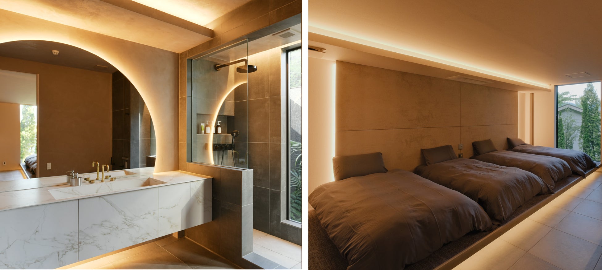 寝室から繋がるパウダールームには、トイレやシャワーの他に、ミラーに映った自分に酔いしれるような大きな鏡のある洗面化粧台をデザインしました。シャワールームからは屋外にデザインしたボタニカルスペースを窓越しに眺めることが出来るように計画しました。