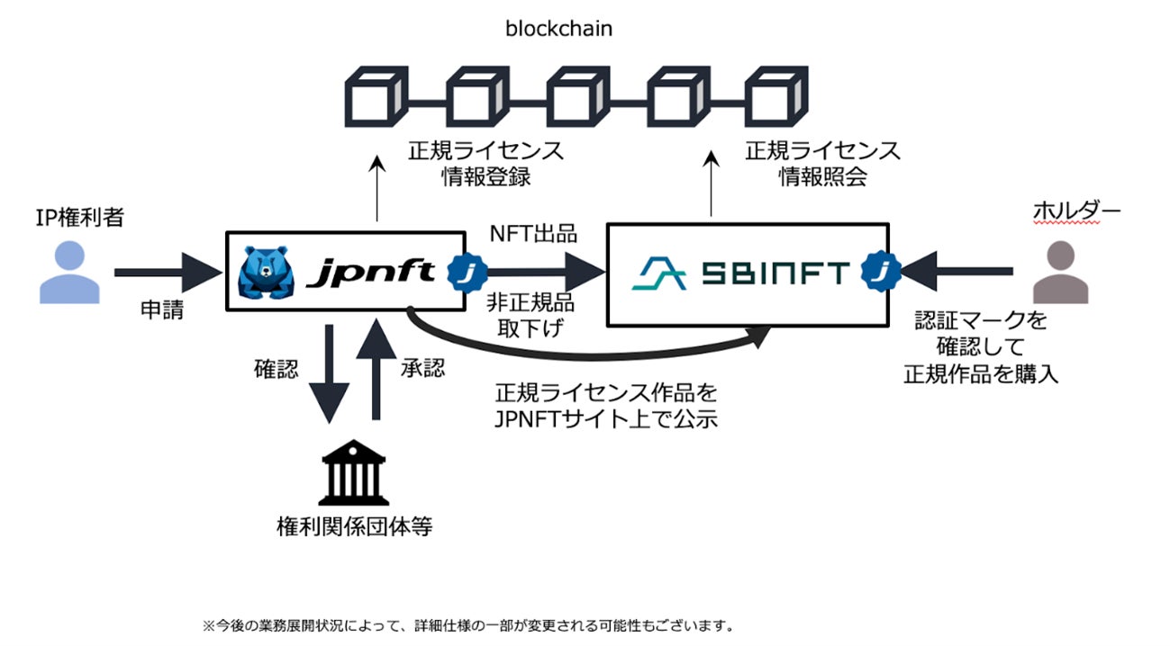 この課題を解決すべく、JPNFTとSBI NFTは、“安心安全なNFTマーケット”を構築し、利用者の皆様に正規のNFTを提供することを使命に、両社の強みをいかしてパートナーシップを結ぶことにいたしました。JPNFTが運営する、コンテンツIPのNFTに関する公式情報公示プラットフォーム「jpnft」に登録・公示されたコンテンツをSBINFTが運営する「SBINFT Market」にて取引する場合には、jpnftでの正規ライセンス情報照会やjpnft認証マークの表示を通じて、正規NFTであることを確認できるようにします。