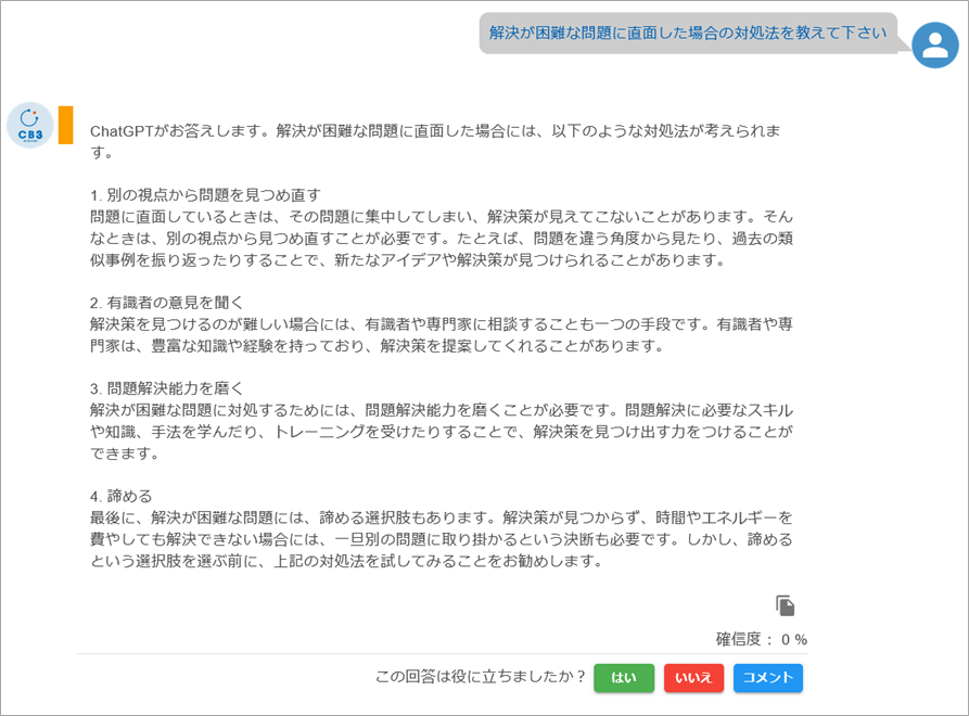 新たな連携機能により、CB3のコーパス(質問回答集)で回答できない質問に対して、ChatGPTから得られた答えを参考回答として表示することが可能になります。