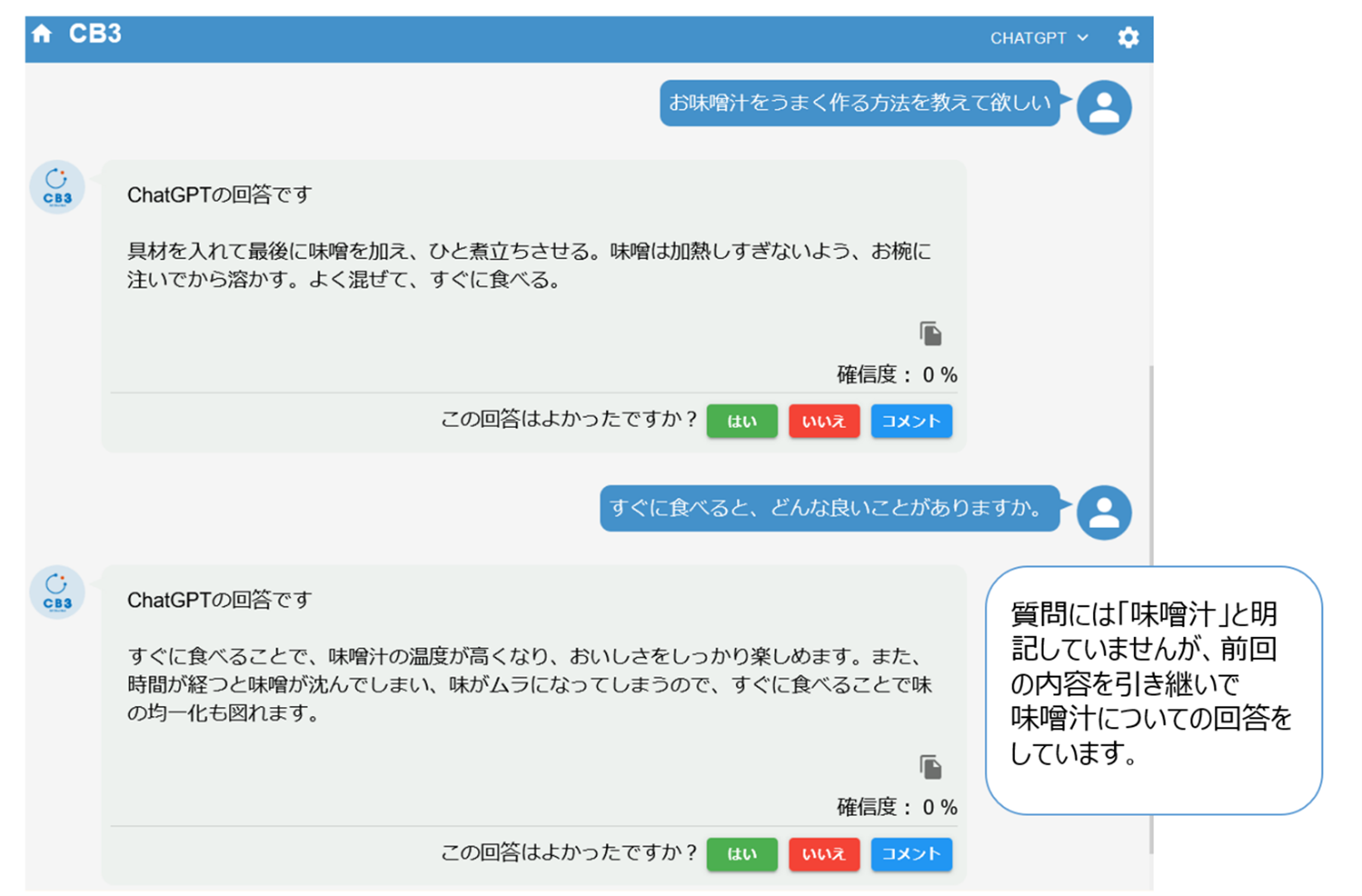 今回の機能追加により、AIチャットボットCB3からシームレスにChatGPTを利用できます。ユーザーはCB3の画面のままでChatGPTへ画面を切り替えることなく、スピーディーかつ安全にChatGPT利用が可能です。