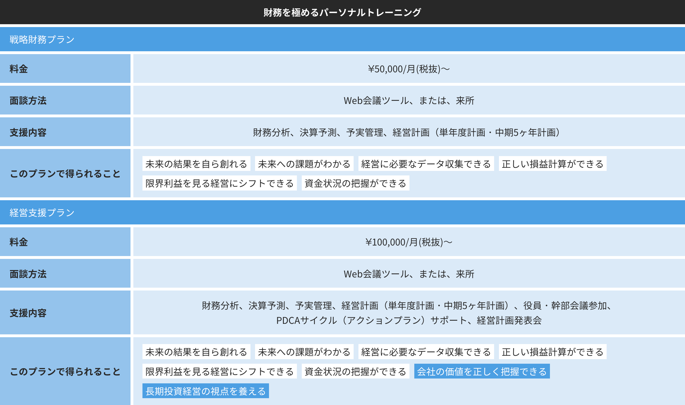 プランは ¥50,000/月(税抜)〜「戦略財務プラン」と、¥100,000/月(税抜)〜「経営支援プラン」の2種類です。両プランとも月1回の月次決算報告の時間を中心に、現状把握・予実管理・モニタリング、というステップを経て、数字上の課題と改善を探ります。