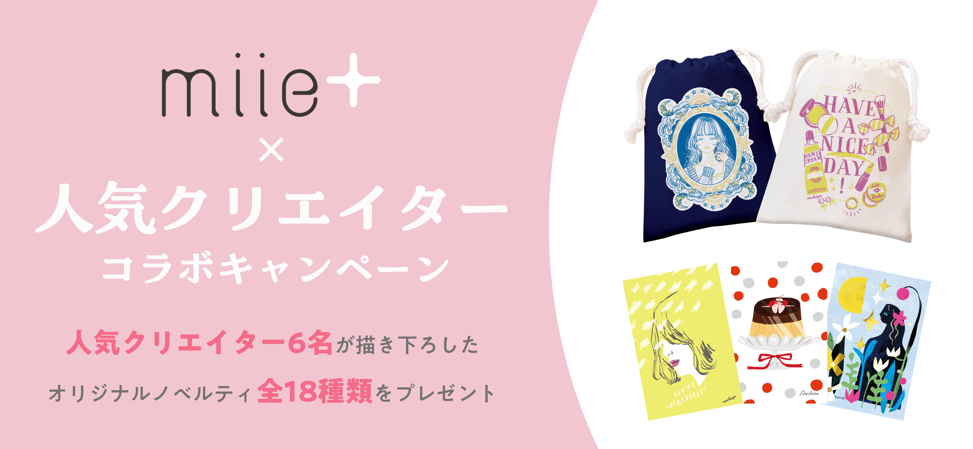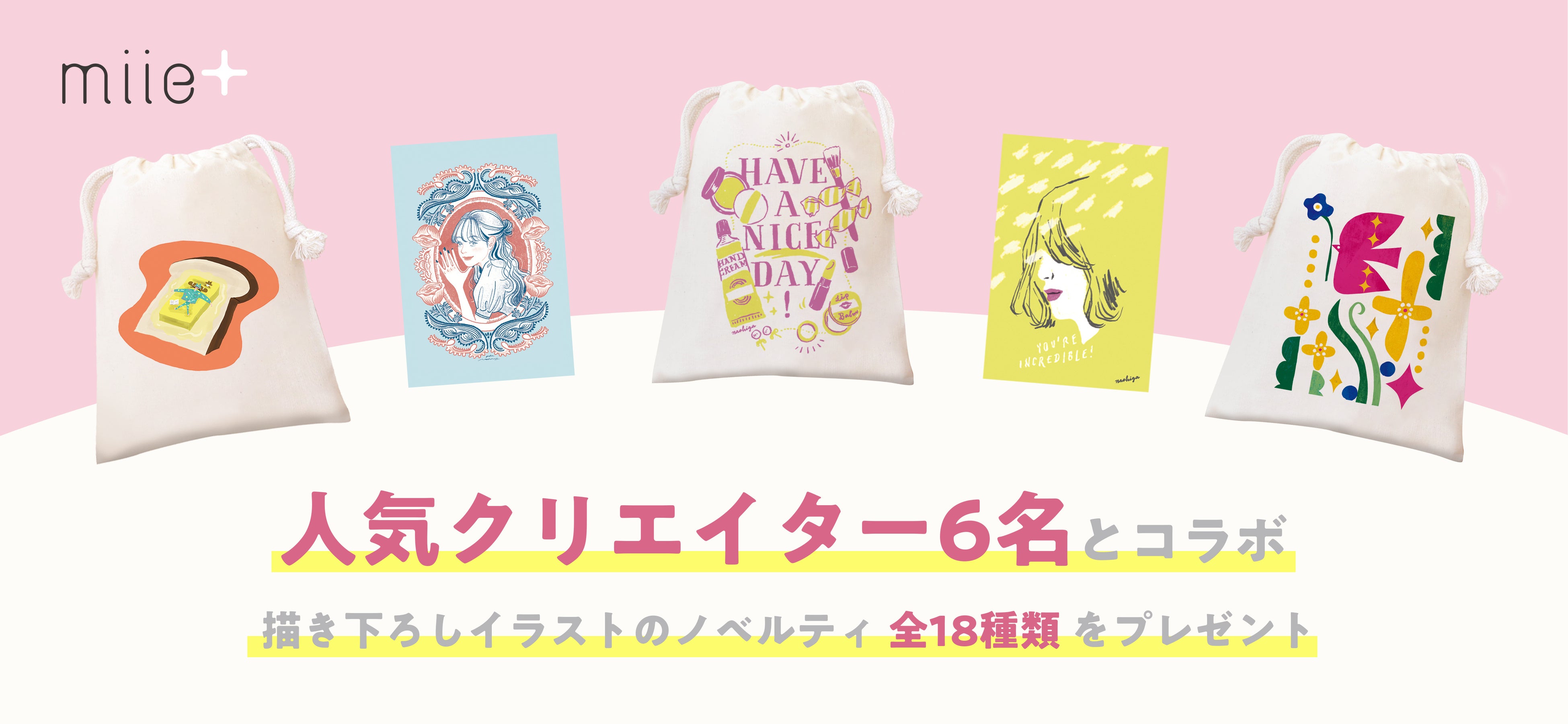 各イラストレーターが、「miie+(ミータス)」とのコラボイラストを2点描き下ろし、ノベルティとして、そのイラストを用いた巾着袋、ポストカード、スマホ用ダウンロード壁紙の3点をご用意しました。