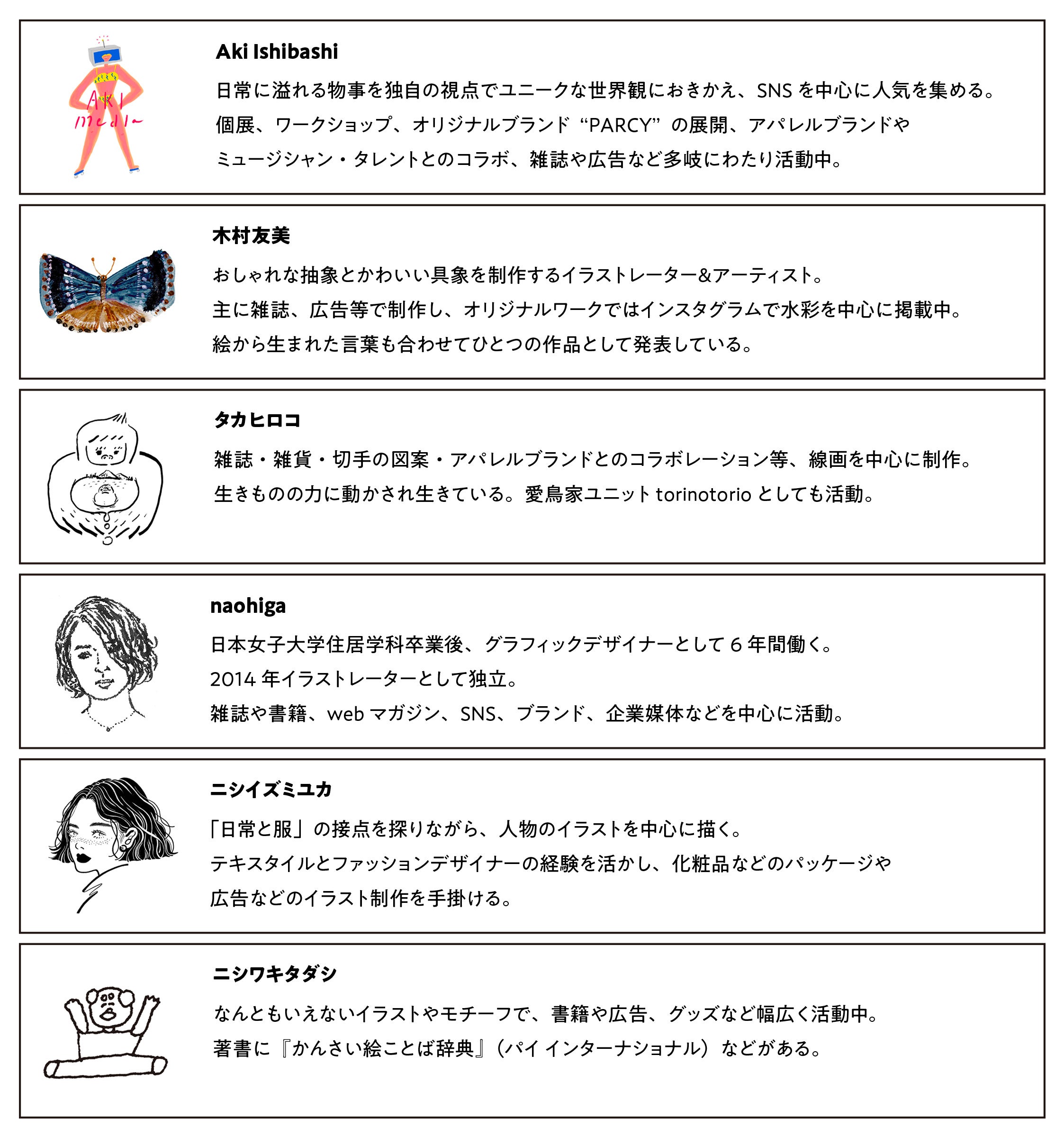 今回コラボしたのは雑誌や企業とのタイアップなどで活躍し、SNSでも人気を博している下記6名のイラストレーター。描き下ろされたイラストは全て今回のキャンペーンでしか手に入らない数量限定のものになります。