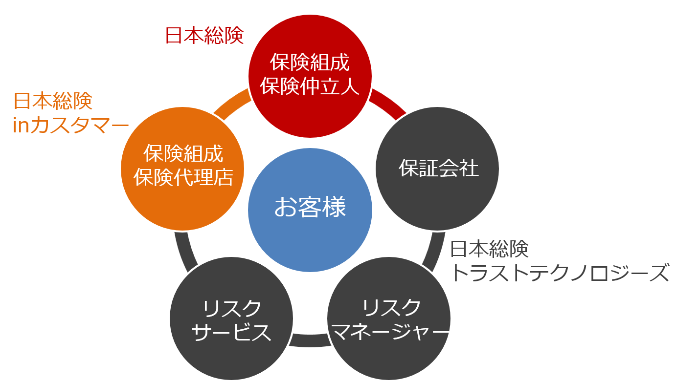 日本総険は上場企業や中小企業等の法人を対象にした保険組成業務。日本総険inカスタマーでは、中小零細企業や個人へのリスクの啓蒙と保険販売。日本総険トラストテクノロジーズでは、顧客の利便性を高め、差別化になりうる保証制度の構築、リスクマネージャーサービスによる調査と啓蒙、およびコンサルティング業務を行っています。
