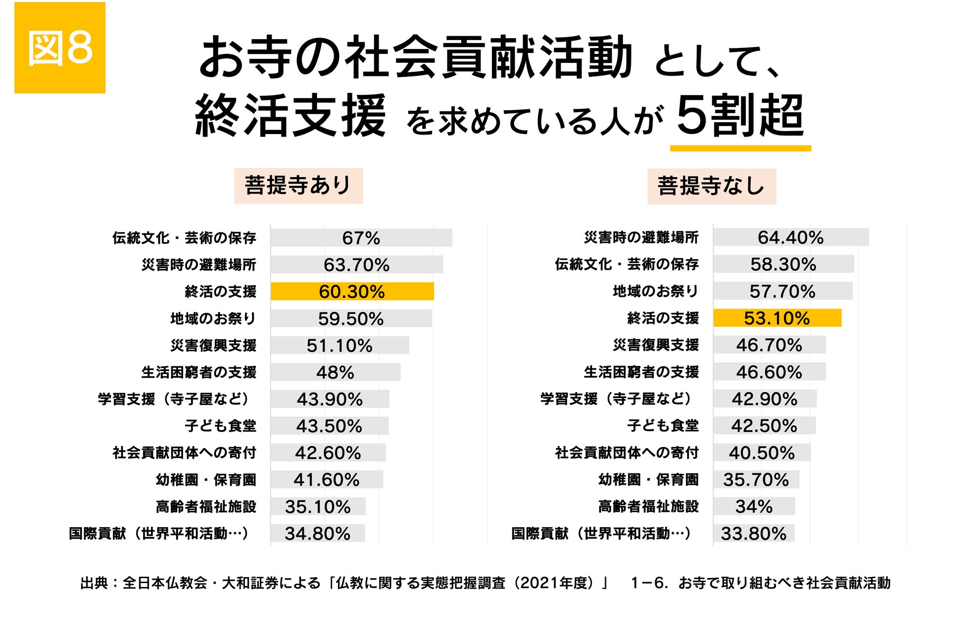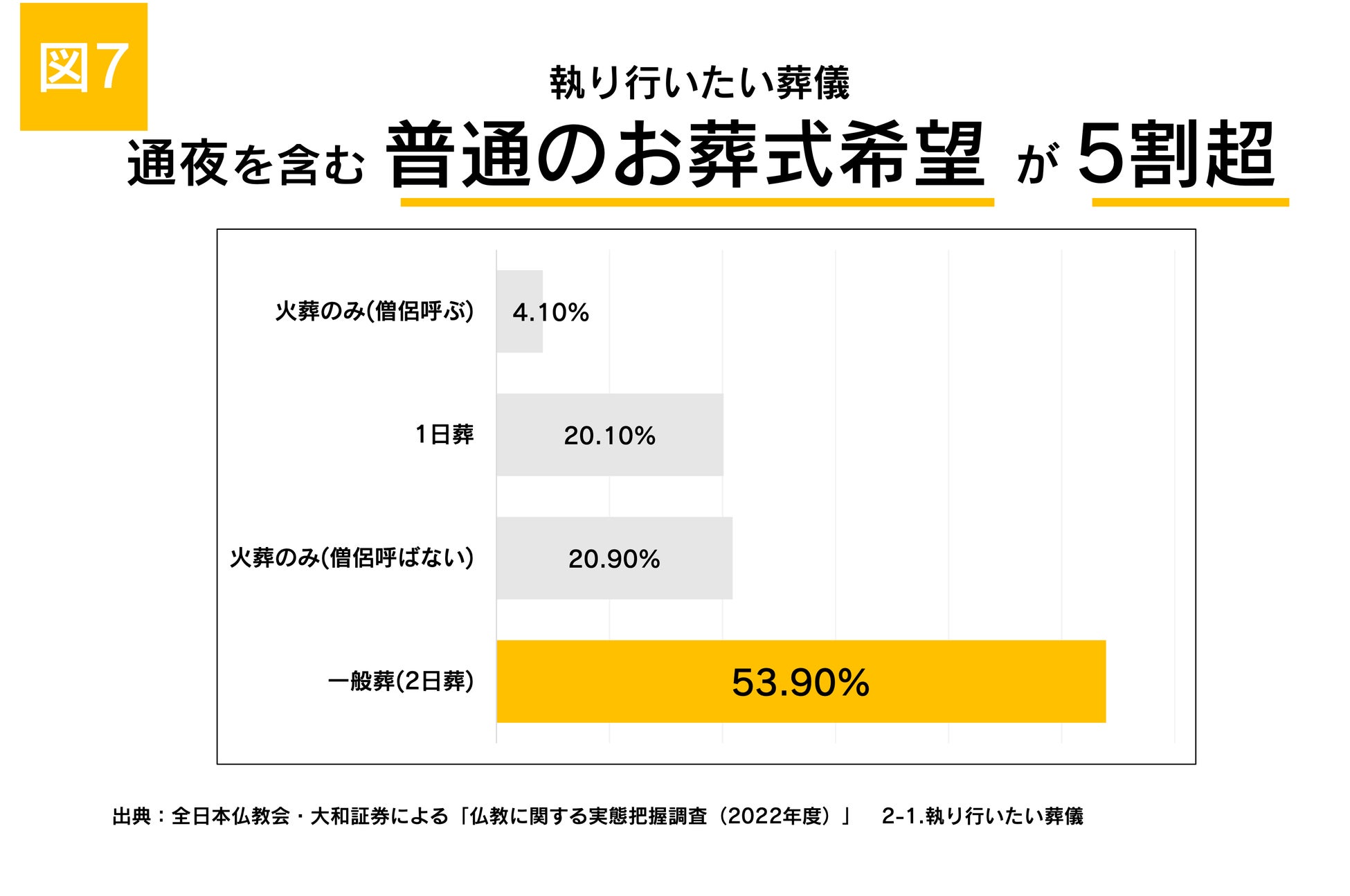 しかしながら、もともとお寺というものは、さまざまな課題を取り込める素地があり、長い年月をかけて築かれた潜在力や課題解決に向けての安心装置(バックアップシステム)が整っています。「仏教に関する実態把握調査報告書(2022年)」によると、(菩提寺の有無を問わず)「普通のお葬式」で執り行いたいと思う人は5割を越えていますが(*図7)、コロナ禍はお葬式や弔いの意義や意味を考えさせられた時期ではなかったでしょうか。手をかけた最後のお別れ・お葬式は、生きている人たちの悲嘆(グリーフ)ケアになりますが、「亡くなった後の儀式(セレモニー)」や「読経」という役割で切り取られたものではなく、日本の仏教で説かれる「縁起」のように、生前からの関連性に基づいた流れの中で紡がれるものだと思っています。
