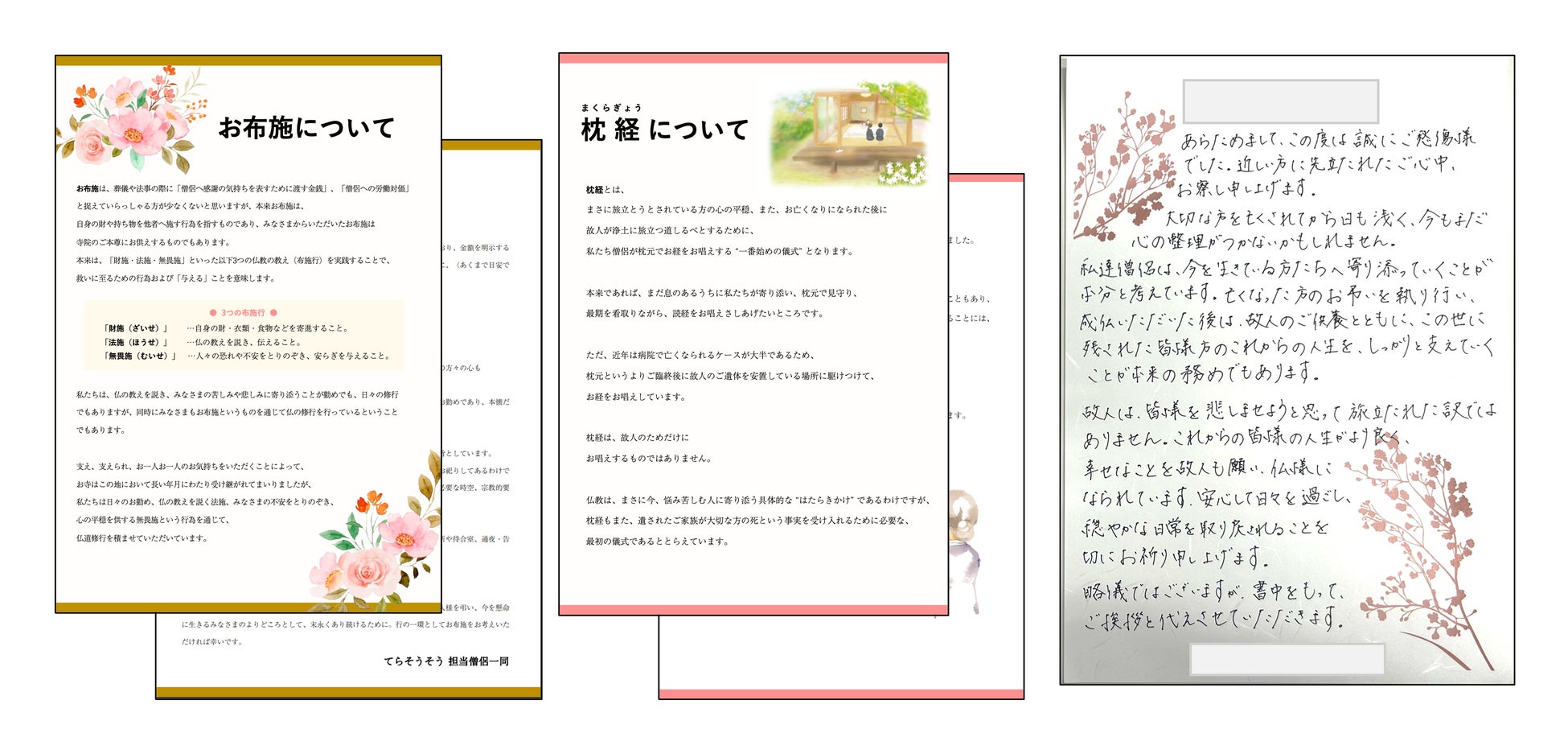 枕経・戒名・お布施のことなど、きちんとご遺族にお伝えしておかなければならないことは、仏さまの教えや住職の考えを踏まえて、ドキュメントにおこしてご説明することで、理解と納得感が深まります。