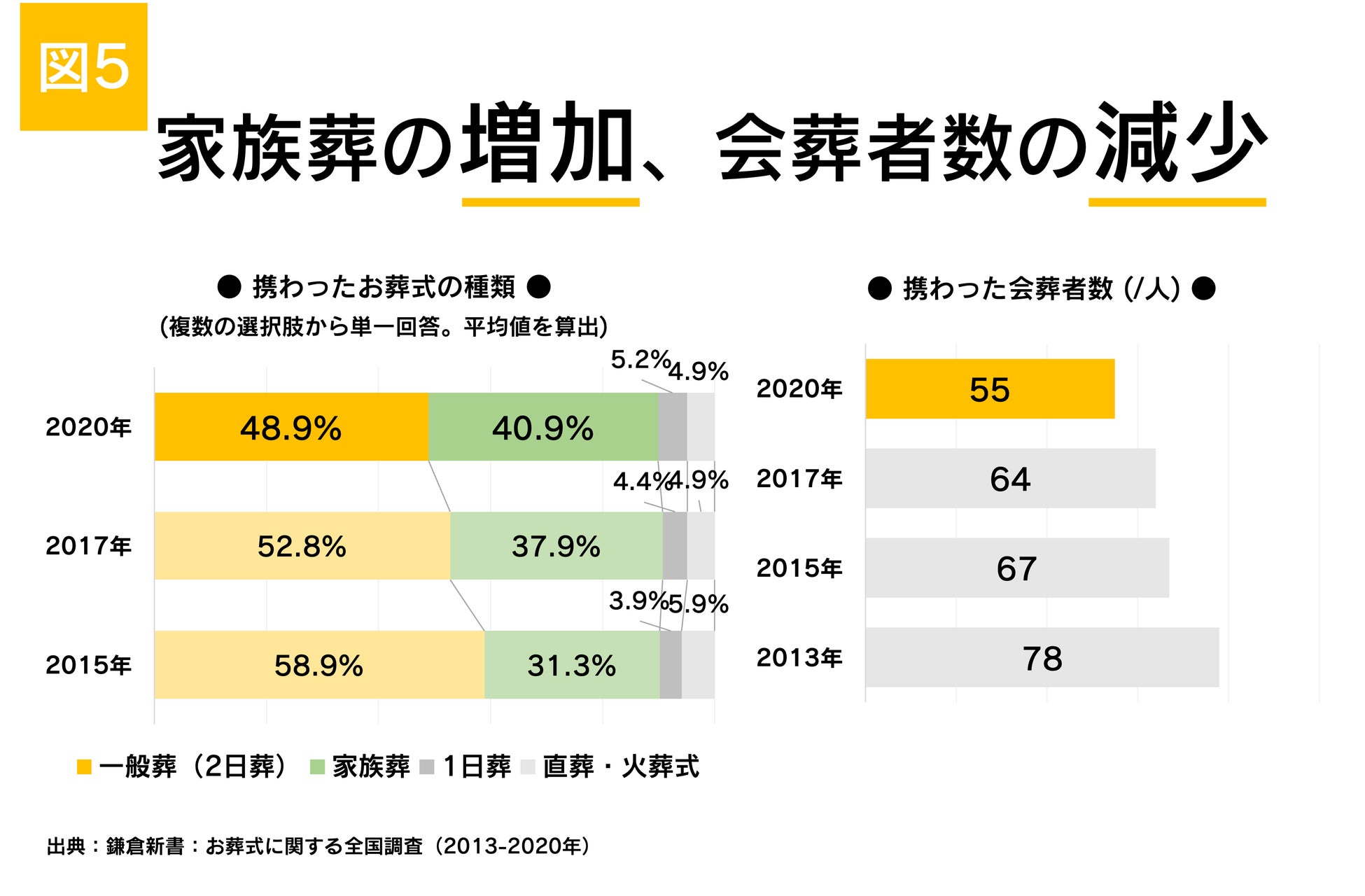 日本は2040年には亡くなる人がピークを迎えますが、単身世帯は4割を越え、核家族化・少子化も進行しています。家族のカタチも近年で大きく変化しましたが、これらの社会変化は「家族葬」や「直葬」といったお葬式の簡素化、小規模化に繋がっています(*図5)。翻ってみれば、家族や50人前後の規模なら、本堂や空間を有効に活用することで、地域のお寺でもお葬式ができる余地、機会が十分あると感じています。