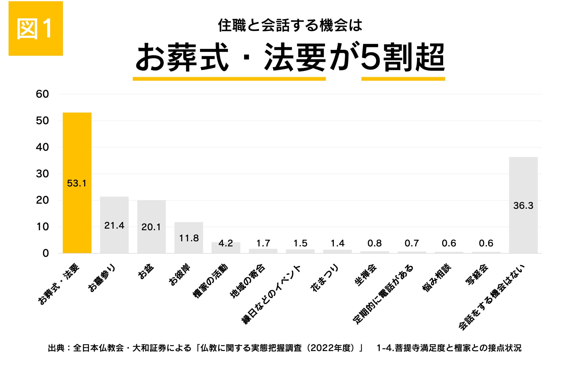 日本の伝統仏教にとってお葬式は重要な布教の足がかりでも、檀信徒と会話をする貴重な場(*図1)でもあります。また、社会からお寺に求められることとしても、お葬式と先祖供養の役割が大きい(*図2)ことは説明するまでもありません。
