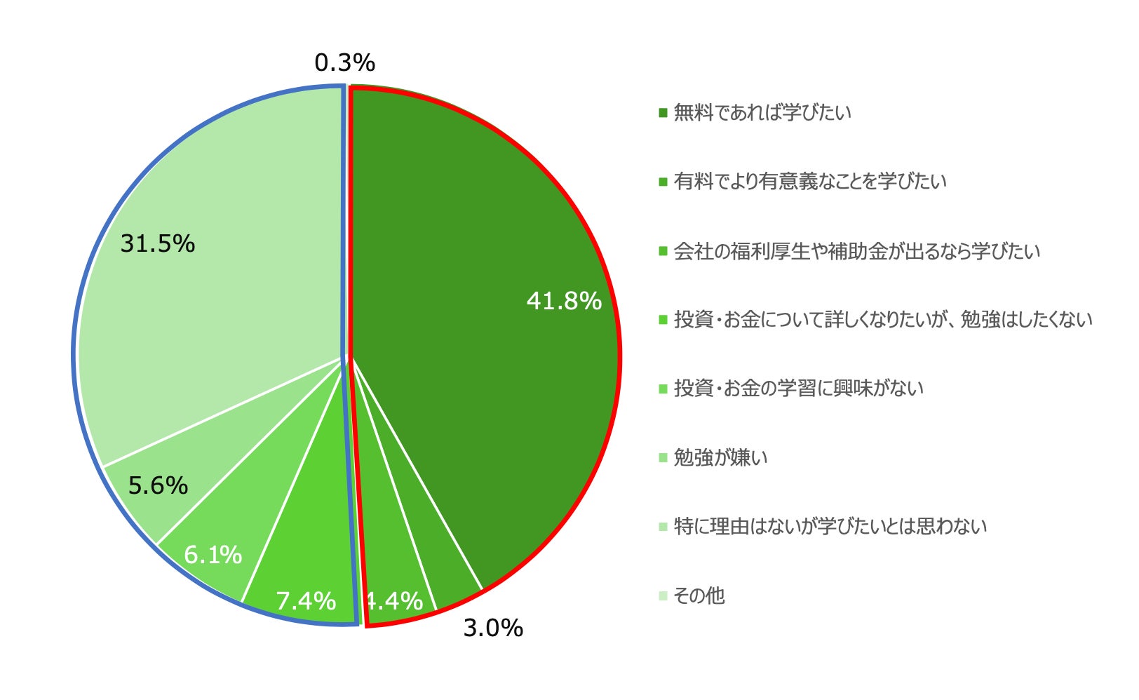一方、二番目に多かった回答は、「特に理由はないが学びたいとは思わない」の31.5%で、「投資・お金について詳しくなりたいが、勉強はしたくない(7.4%)」「投資・お金の学習に興味がない(6.1%)「勉強が嫌い(5.6%)」を合わせた、学ぶ意欲のない人の合計も50.6%と約半数という結果となりました。