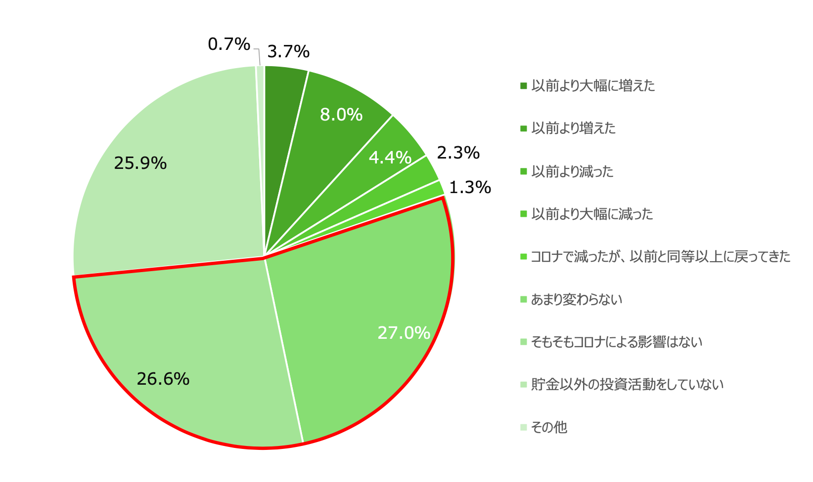 次に、年間で投資に活用する金額について、コロナ以前と比較して変化があったか聞いたところ、「あまり変わらない(27.0%)」「そもそもコロナによる影響はない(26.6%)」との回答が高く、合わせて5割以上の方は、コロナの影響がなく、年間の投資額もほぼ変わっていないということがわかりました。