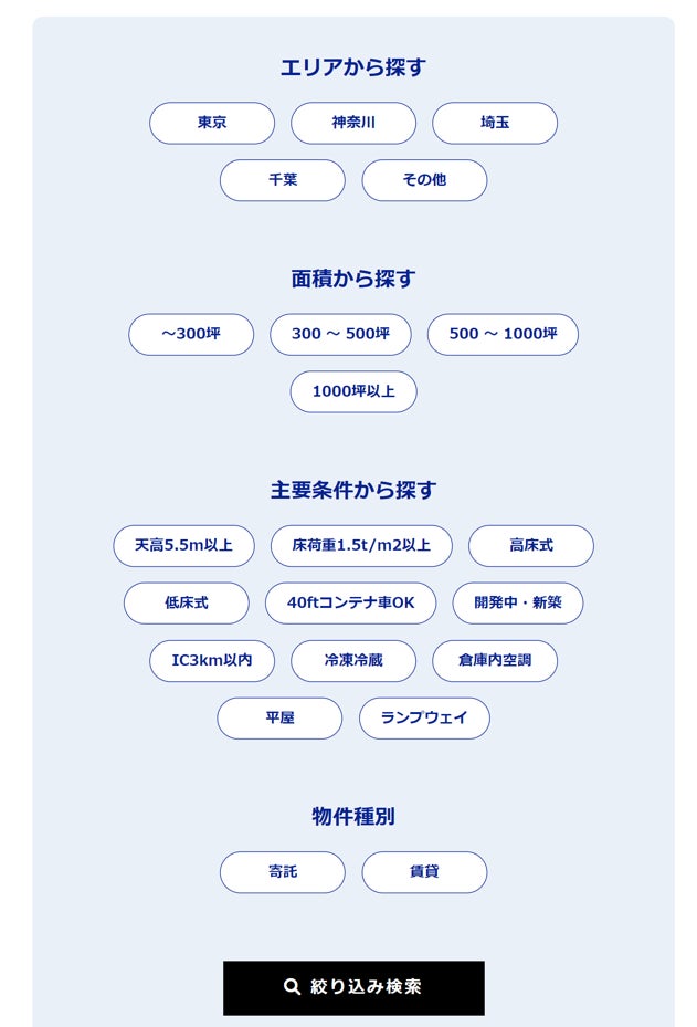 通常の倉庫検索サイトと違い、貸す・借りるだけでは無く、寄託業務(協力企業)まで探すことが可能となっております。新規案件の受注での増床や急なバッファ倉庫のお探しの方が、スムーズに倉庫検索を行っていただけるよう複雑な操作を極力なくし、シンプルなデザインと使い勝手の良さにこだわりました。スマートフォンやタブレットなど、様々なデバイスからのアクセスに対応しております。
