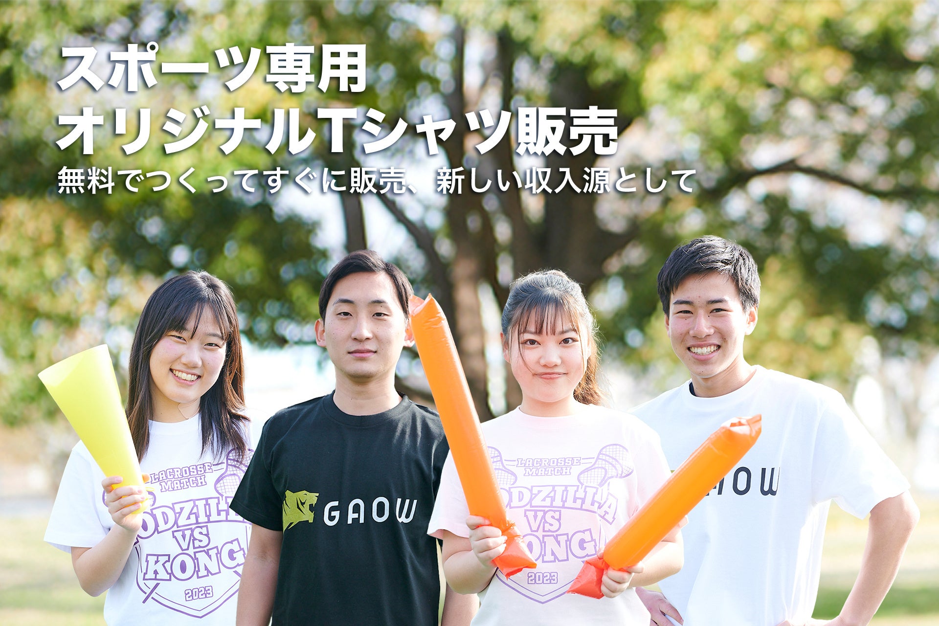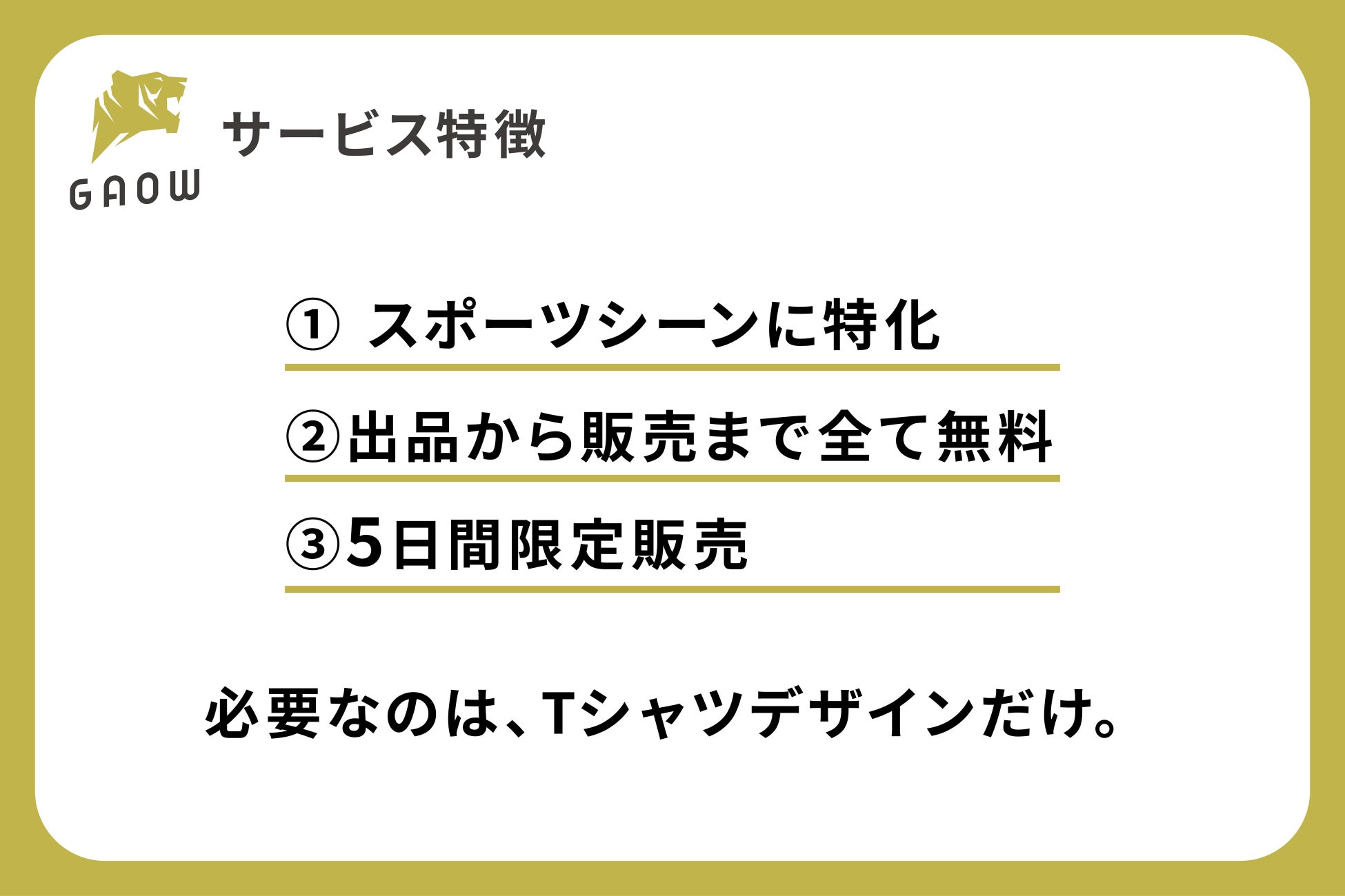 GAOWはスポーツ関係者がオリジナルTシャツの作成から販売までを一括にできるサービスです。サービスの特徴を3つ挙げますと、①スポーツシーンの出品に特化していること。②出品から販売まで全て無料で行えること。③5日間の期間限定でTシャツ販売ができること。になります。もちろん出品にかかる費用負担は一切なく、在庫管理や配送管理の手間もないので安心してサービスをご利用いただけます。