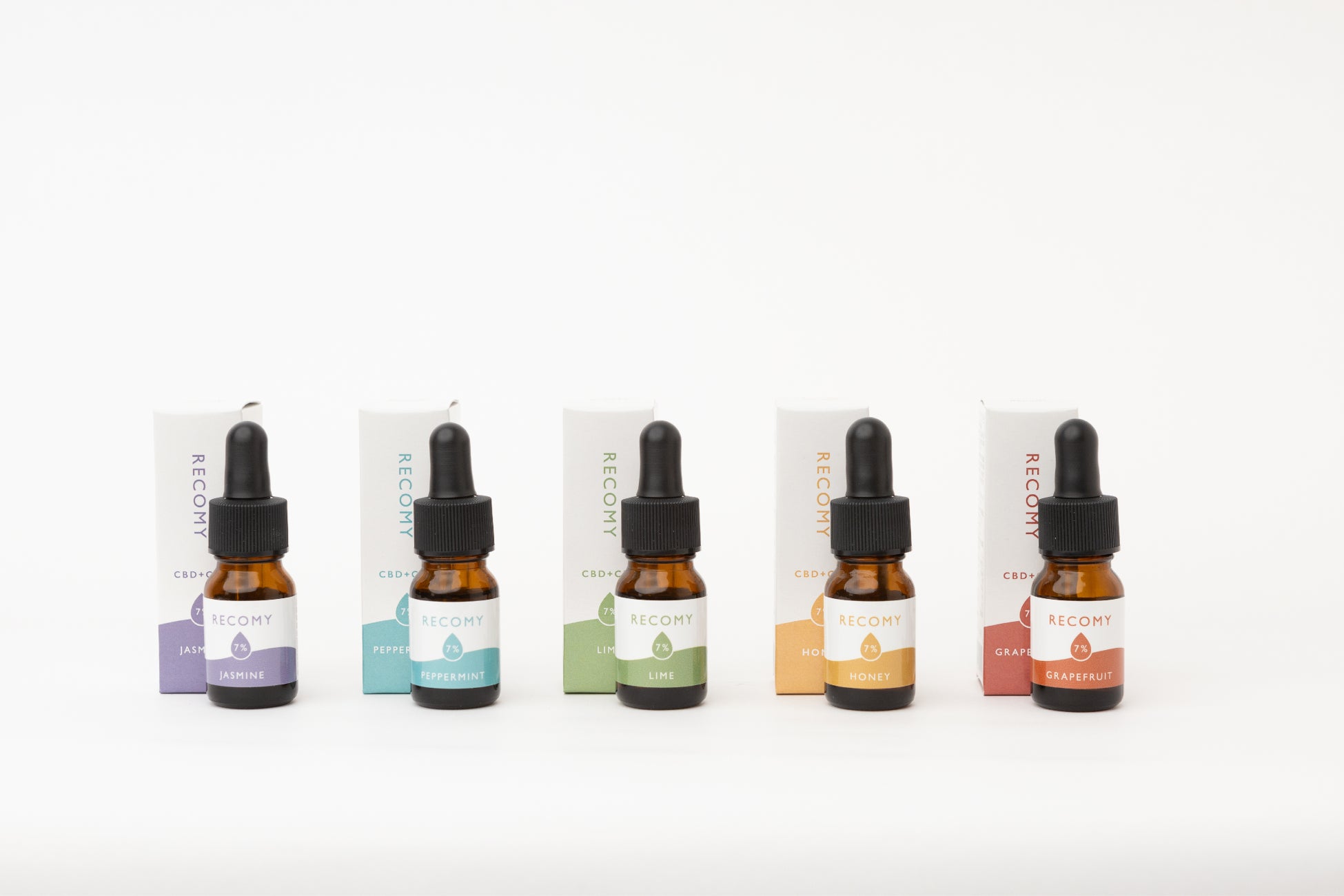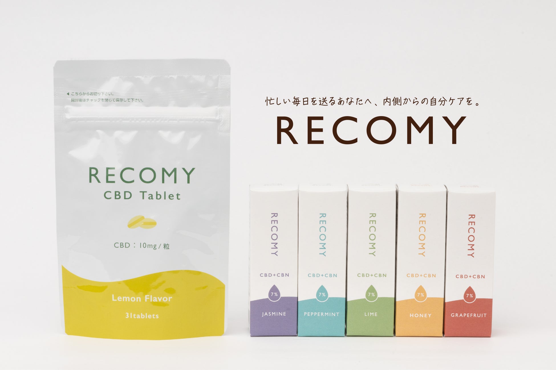 そんな毎日を頑張る方々へ、RECOMYは、各種1日1回を目安に、健康食品のような感覚で取り入れられる形態、かつ見た目がコスメにあるような慣れ親しんだデザインにすることで、CBDが初めてでも手に取りやすいような製品を作りました。