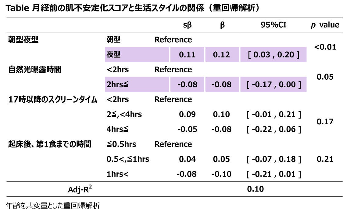 早寝早起きで朝に強い人を朝型、夜更かしが多く朝に弱い人を夜型と定義し、本人が自覚する「朝型」「夜型」の2群に分けて解析したところ、朝型と比べ、夜型が月経前の肌不安定化が有意に大きいことが示唆されました(Table)。