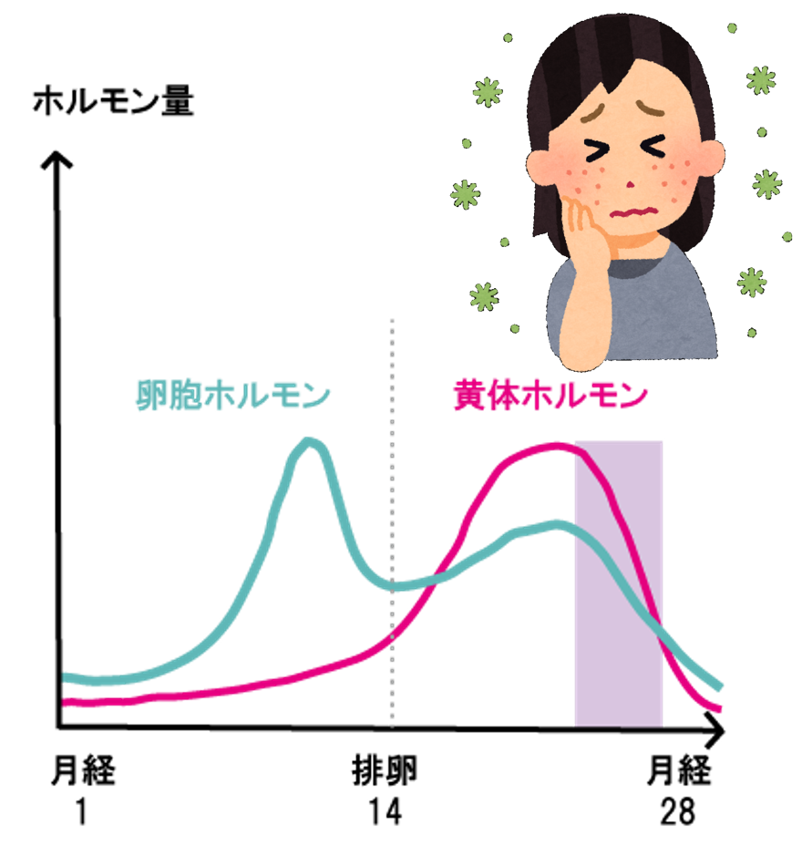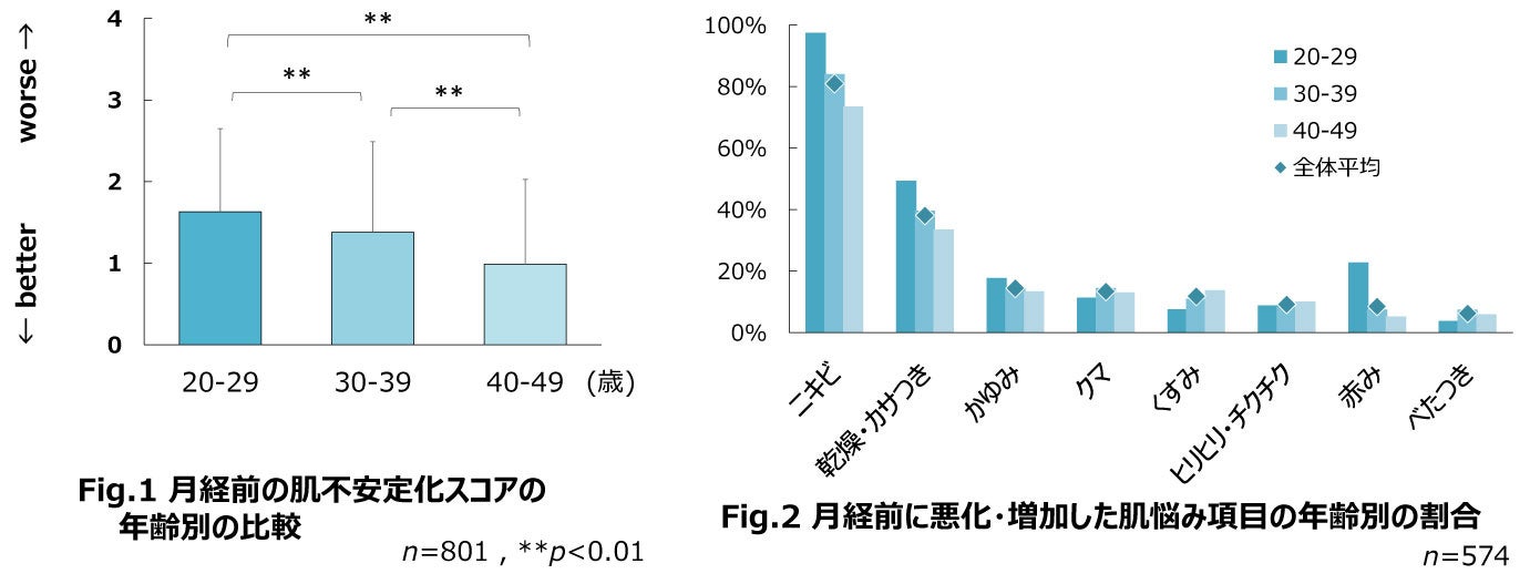 月経前の肌の不安定化は、20歳代で最も大きく、ニキビの割合が高い。