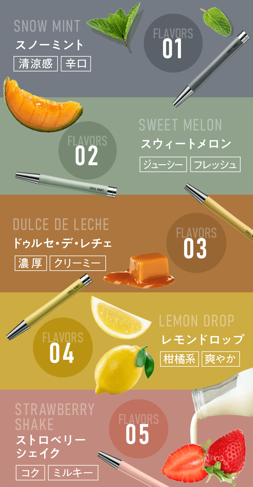緻密な調整を何度も重ね、本物と遜色ないレベルまで仕上げた5種類のフレーバーが完成しました。