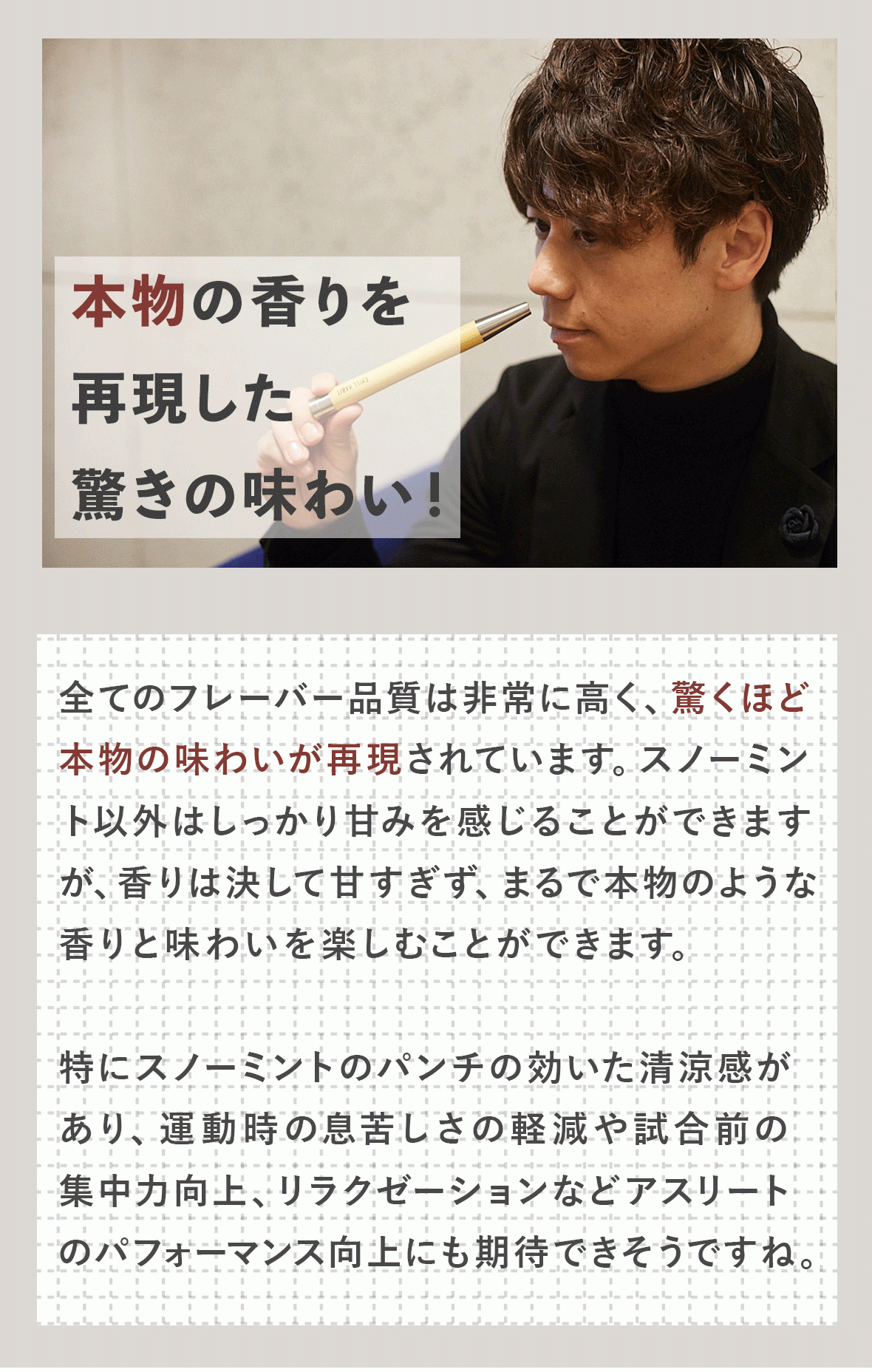 スノーミント以外の香りはしっかり甘めですが、 フレーバーは決して甘すぎず、まるで本物のような香りと味わいが楽しめます。