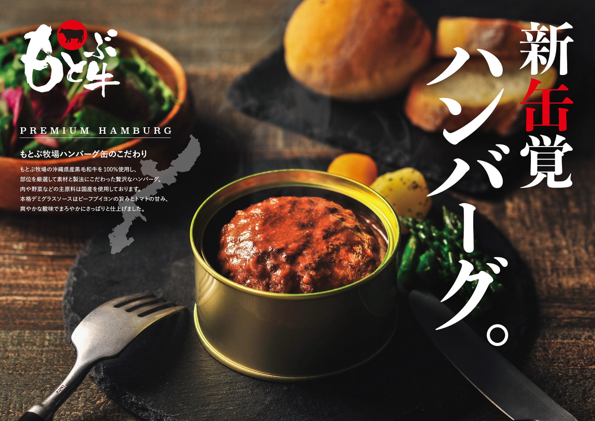 【もとぶ牧場ハンバーグ缶】は、自然豊かな沖縄島北部のやんばる地域で豊かな自然と人の愛情でのびのびと育てられた、沖縄ブランド黒毛和牛「もとぶ牛」を使用した贅沢なハンバーグの缶詰です。既存の冷凍ハンバーグもご好評をいただいておりますが、今回は缶詰にし、常温で3年間も日持ちする商品に仕上げました。