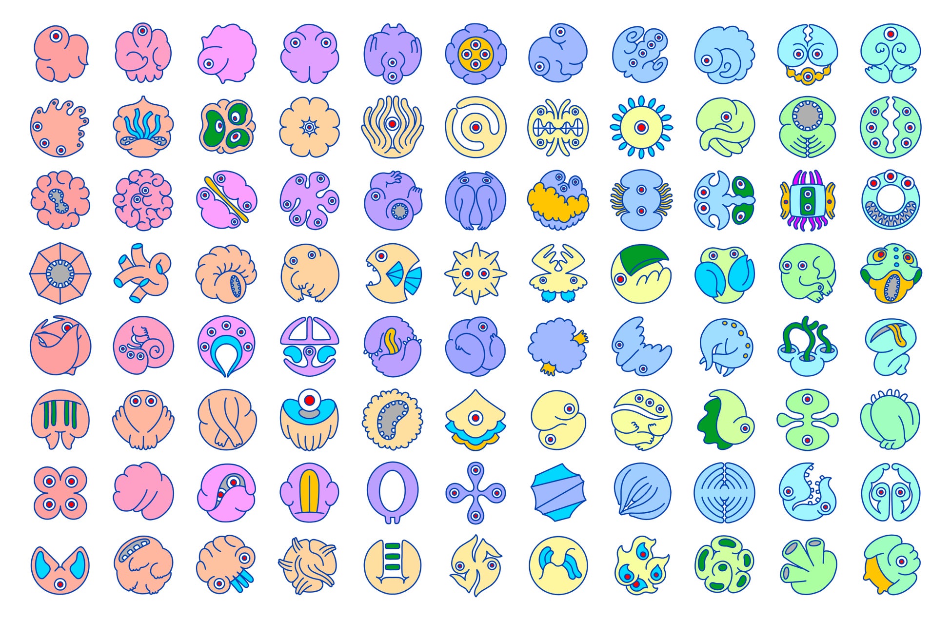 INTO8の8に因んで、全88種類のキャラクターがいます。 漢字の八は末広がり、数字の8は横に倒してインフィニティ(∞=無限)など、 8には拡張していくイメージがあります。また丸が2つ上下に並んでいるようにも見えることから、卵や細胞核を模した円形のキャラクターたちを描きました。それらが無限にメタモルフォーゼしていく...そのようなイメージでデザインしました。