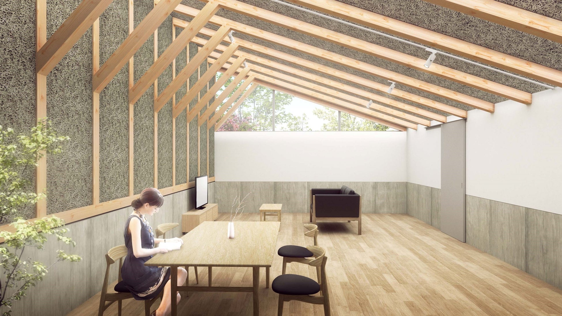 建物の躯体を覆い隠さず現す「構造躯体現し」等で自然素材による組み合わせで整えられた空間は、中のような、外のような不思議な感覚が感じられます。構造梁を意匠にしたデザインや、随所に使用した木材によってぬくもりと居心地の良さを感じていただける、今までにないゲートハウスになっております。