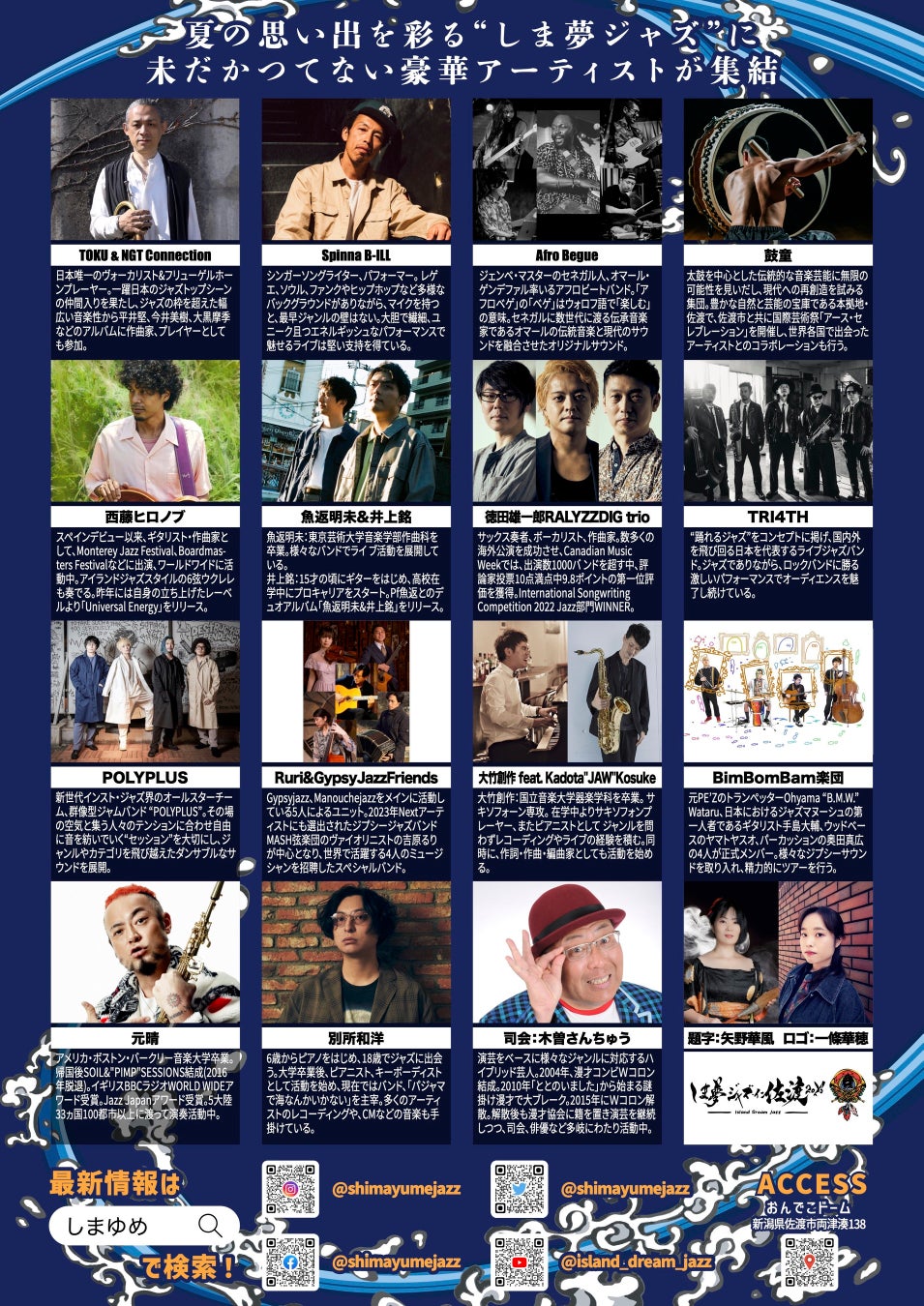 また、元PE'ZのトランぺッターOhyama“B.M.W.”Wataruと、日本におけるジャズマヌーシュの第一人者であるギタリスト手島大輔が率いるBimBomBam楽団が、元SOIL&“PIMP”SESSIONSの元晴(SAX)、Gentle Forest Jazz BandやSUGIZO主催のSHAGのメンバー、別所和洋(ピアノ)と共に、イベントのために作曲、レコーディングに鼓童も参加した特別テーマ曲「シマユメ~Island Dream~」を披露します。