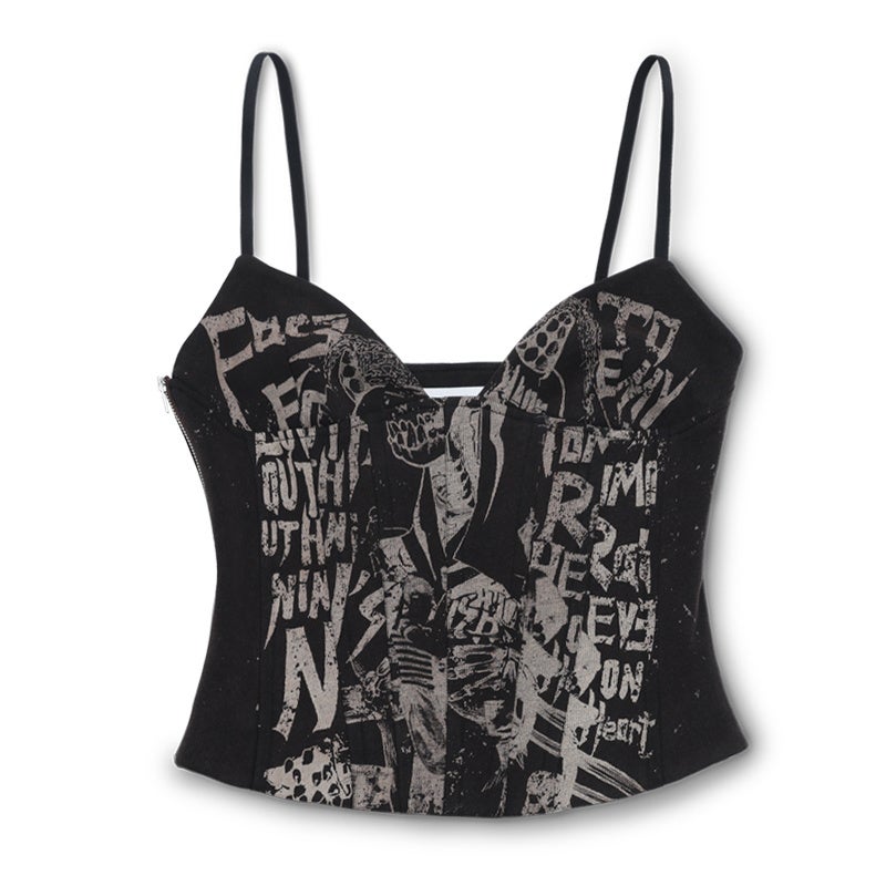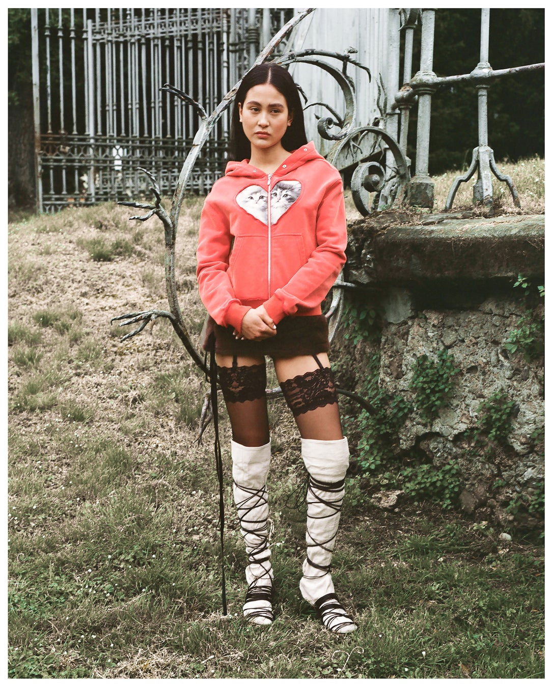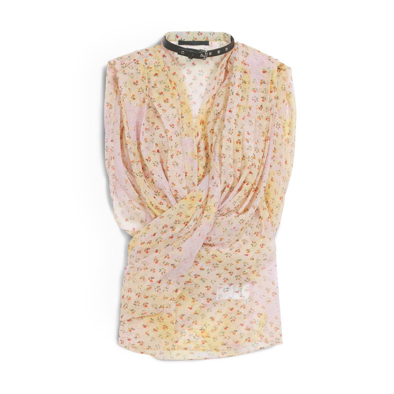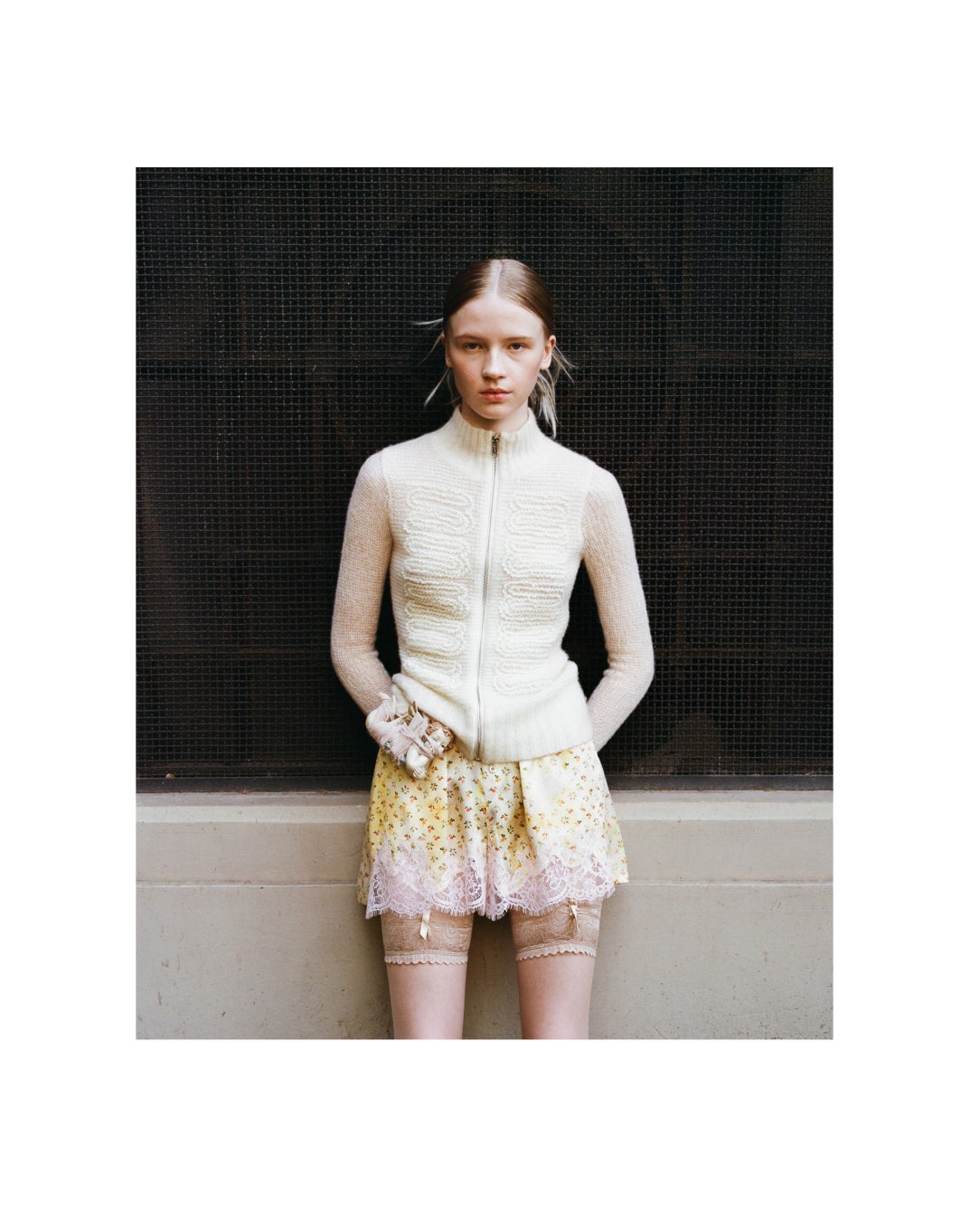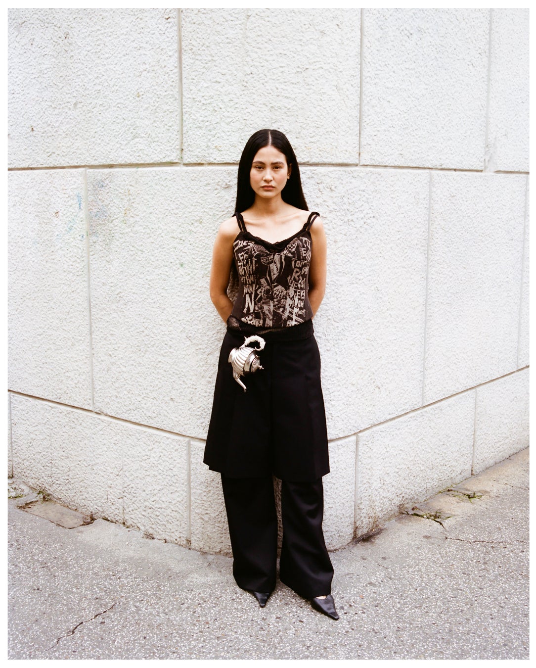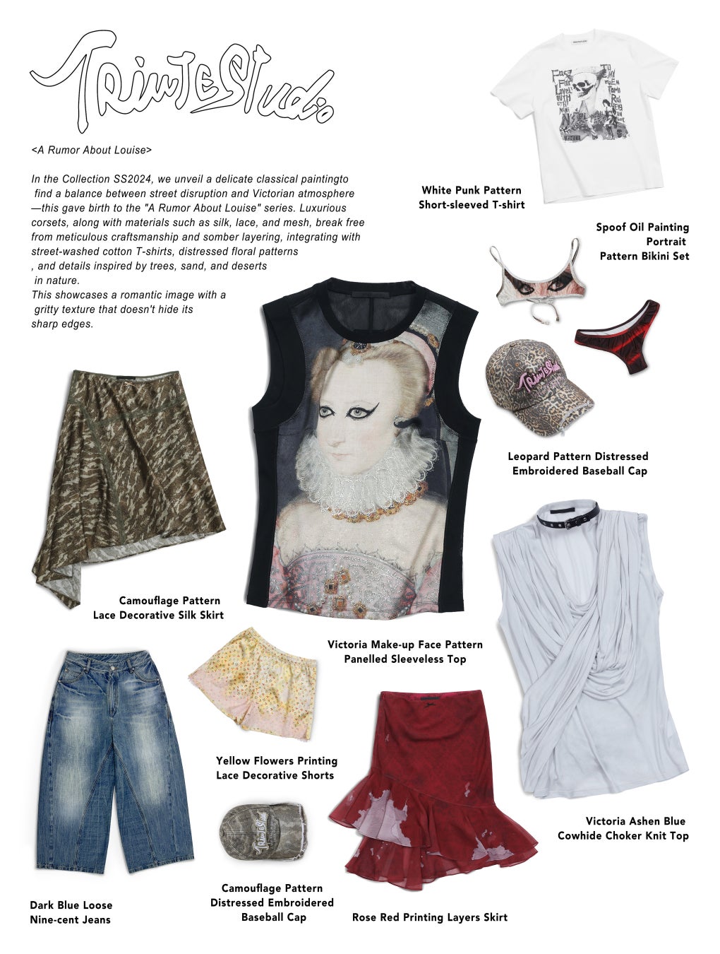 24SSコレクションテーマを【A Rumor About Louise】と題し、ストリートの混乱とヴィクトリア朝の雰囲気の中にオリジナルのバランスを見出し今回のコレクションが誕生しました。華美なコルセットやシルク、レース、メッシュなどの素材は、緻密な職人技や地味なレイヤリングから解き放たれ、ストリートウォッシュ加工を施したコットンTシャツ、意図的にディストレス加工を施した花柄、自然の木々や砂、砂漠などからインスパイアされたディテールとうまく融合しています。