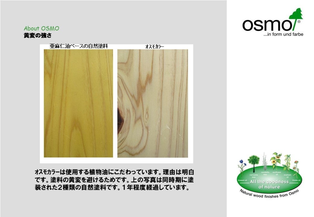 多くの自然塗料は主成分が亜麻仁油ですが、オスモUVオイルはひまわり油・大豆油・アザミ油・カルナバワックス・カンデリラワックスを配合することで高い保護能力を実現。ウレタン塗装と同等の保護能力を誇ります。