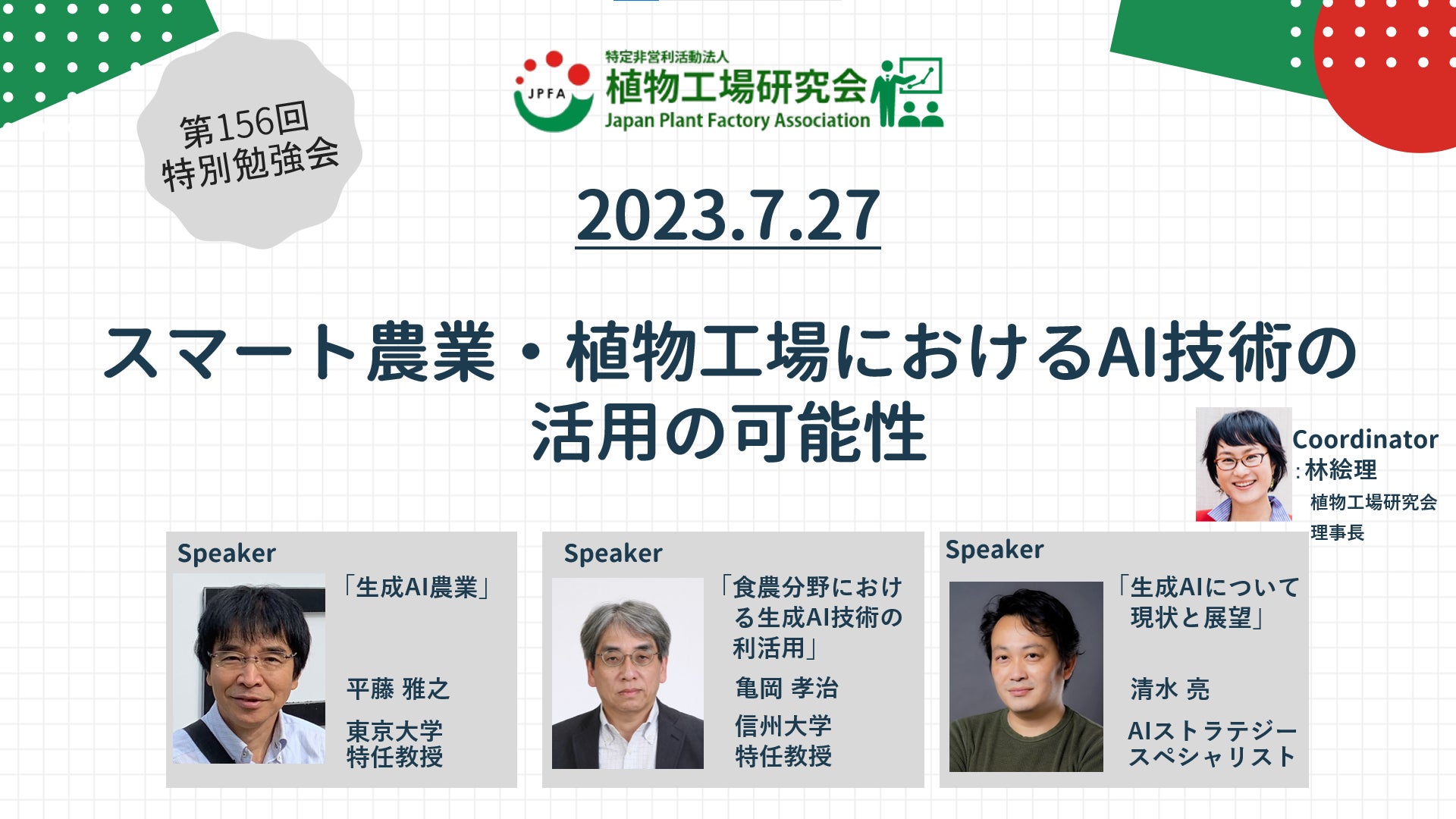 植物工場のみならず、農業やフードシステム全般におけるAI技術の活用可能性や生成AI技術動向と展望に関する講演など、スペシャルゲストをお招きする特別企画です。