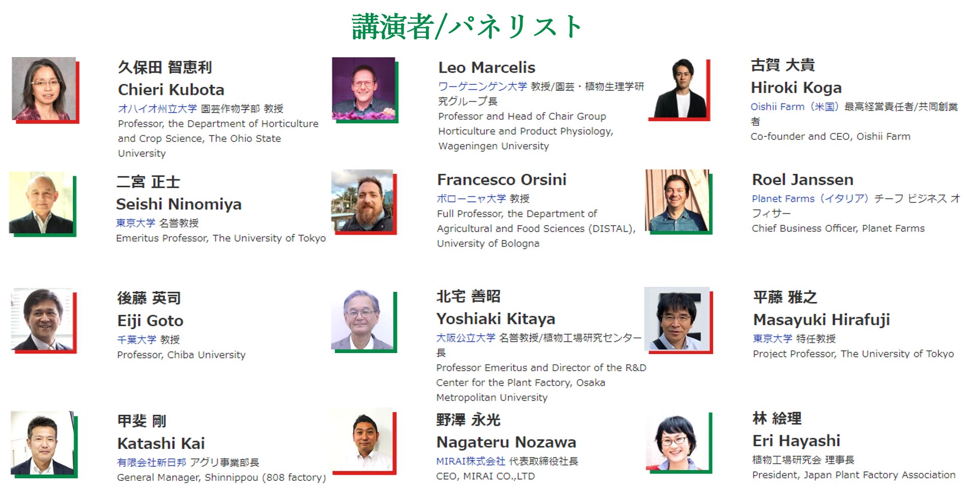 シンポジウムでは『宇宙農場、生成AI技術を活かした植物工場、日本の技術を活用した米国での大規模イチゴ植物工場展開、世界の植物工場動向と将来性、植物工場における光利用効率・その他資源利用効率の向上、植物フェノタイピング、次世代培養液管理、育種、イタリア式全自動植物工場、都市農業、循環型経済に向けた植物工場、スマートシティにおける植物工場、植物工場ビジネスの課題と展望』などをキーワードとして取り上げます。国内外で活躍する研究者や今注目の経営者と共に、様々な切り口からインタラクティブなセッションを開催します。ぜひご参加ください。