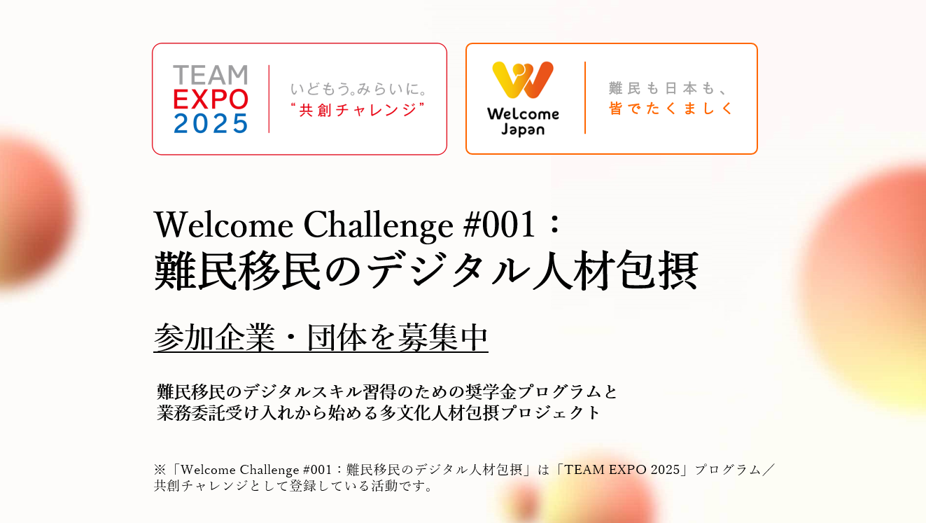 「Welcome Challenge #001 難民移民のデジタル人材包摂」(「TEAM EXPO 2025」プログラム/共創チャレンジ)は、Welcome Japan就労分科会DX人材委員会で検討され、発足しました。