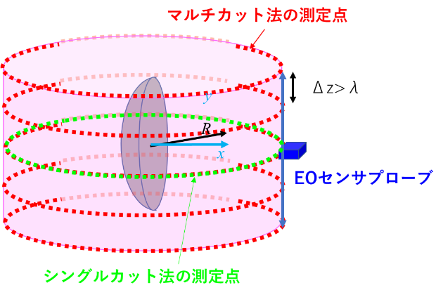 説明)シングルカット法とマルチカット法の測定点の配置を示す。Z方向の測定間隔は従来大きいため測定時間の短縮に繋がる。