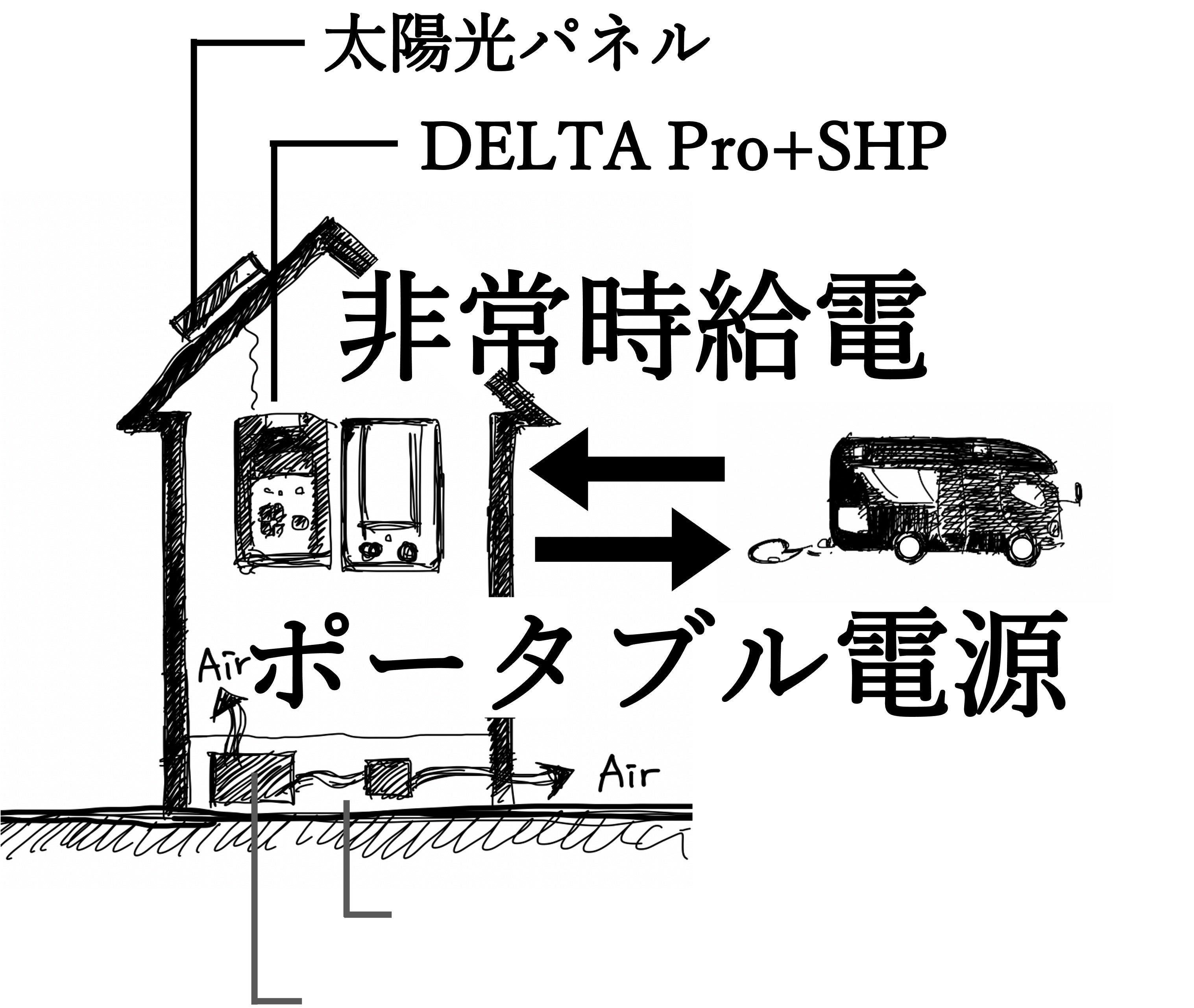 (蓄電池)+スマートホームパネル(以下SHP)をオフグリッドな給電方法で組み込むことで、省エネやりモートワーク、非常時対策等、時代に合った性能を搭載しています。