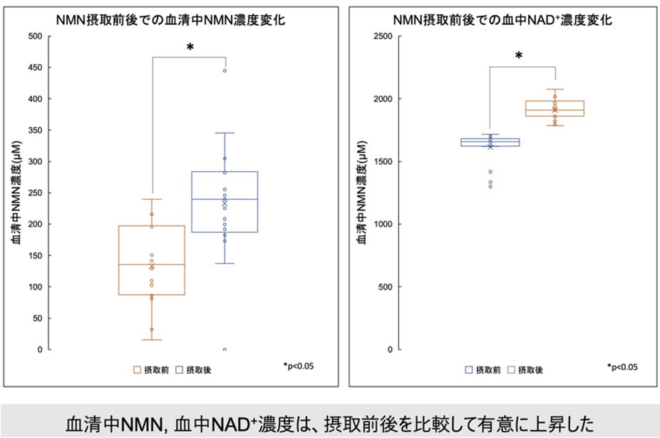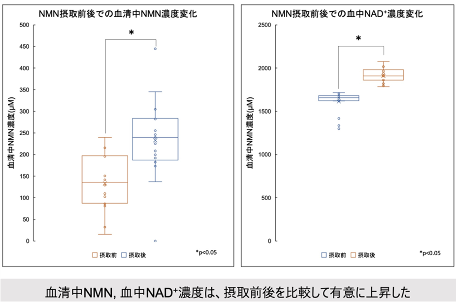 他の論文とは試験条件が異なるため単純に比較出来ないが、今回の血中NMN濃度の上昇率は1.7倍とかなり高く、継続的かつ大量のNMN補給によって高NMN濃度が維持されたと思われる。