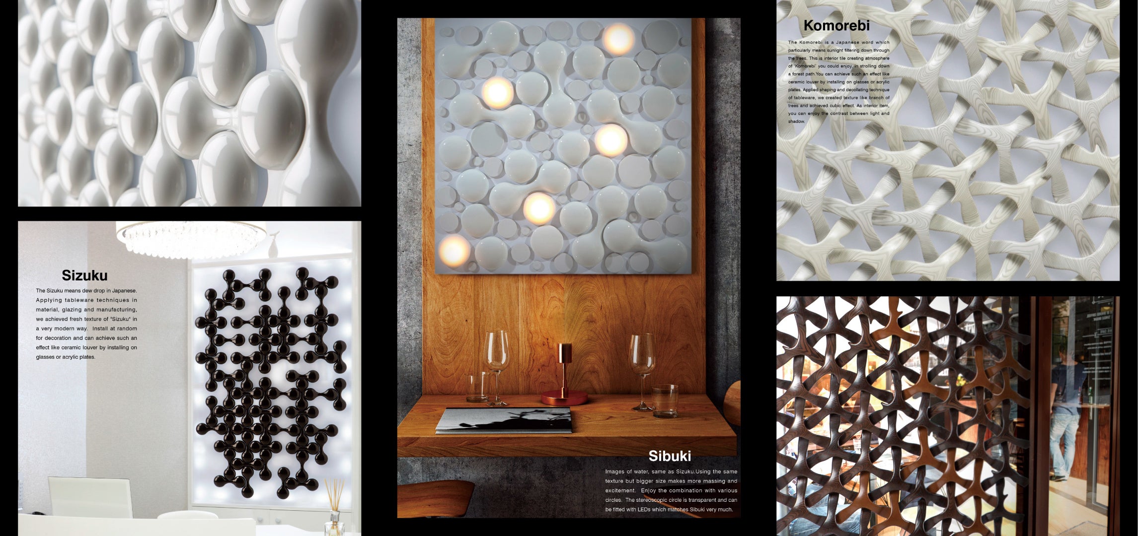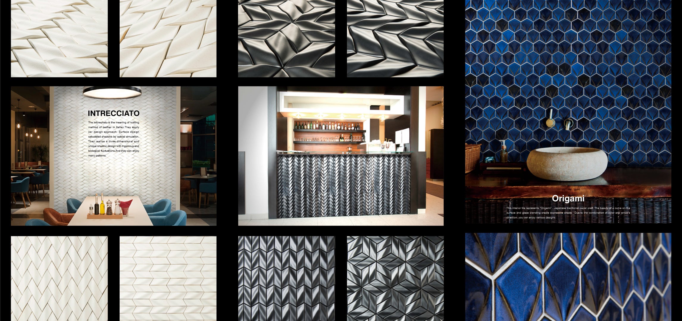 その他では、OEMに特化した陶磁器メーカーの京陶窯業(株)様からの依頼で立ち上げたオリジナルブランド「KYOTOH」プロジェクトや、複数のタイルメーカーと連携し、イタリアの見本市を起点としたグローバル展開するプロジェクト(市場が縮小する国内向けの外装・床タイルの薄利多売の大量生産モデルから脱却し、欧米への輸出に通用する付加価値の高いインテリアタイルを開発)等、様々な事例があります。
