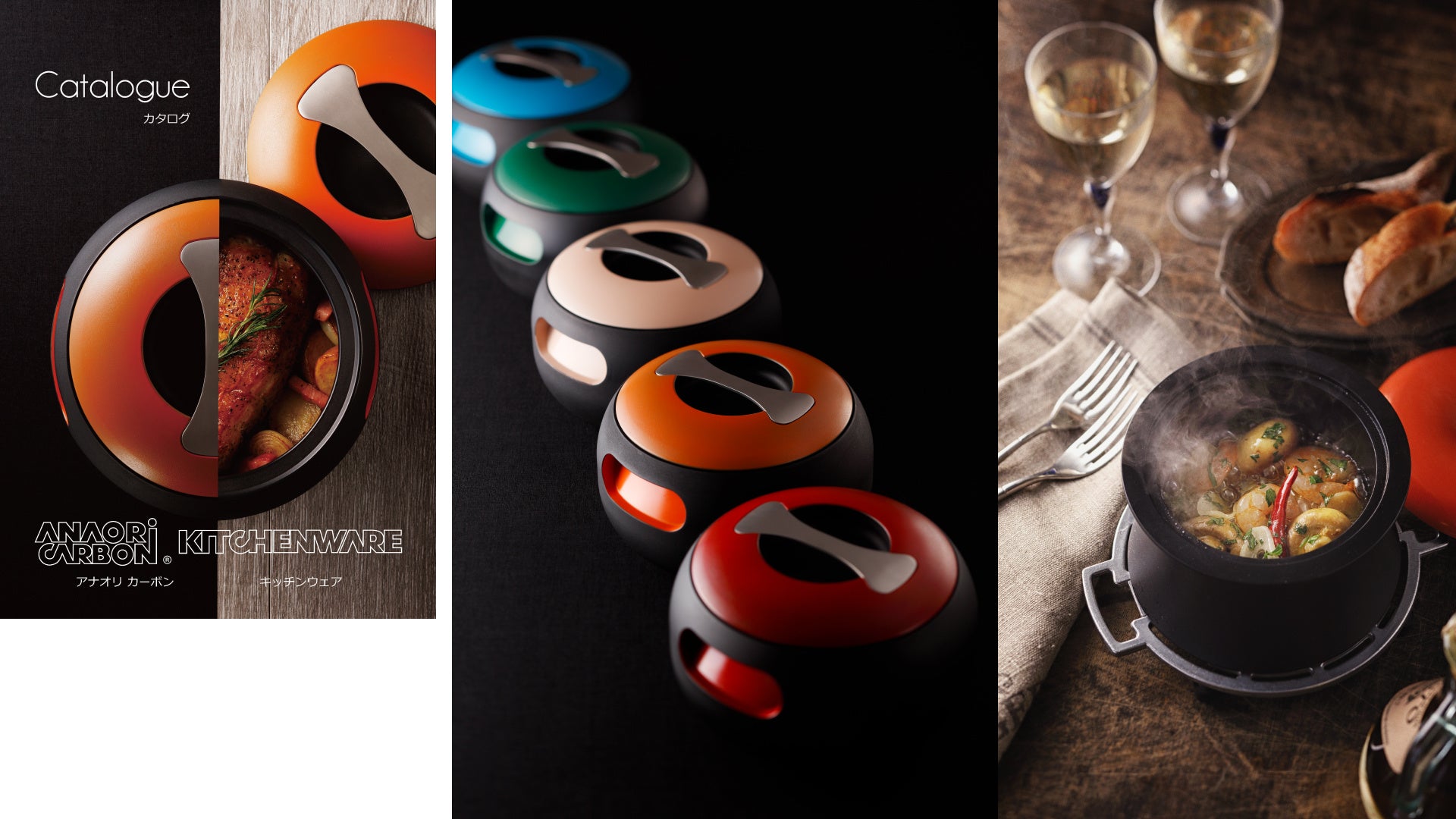 その一例が、グローバルなブランド構築を目指していた大阪のカーボンメーカーの穴織カーボン(株)様からの依頼で立ち上げたオリジナルブランド「ANAORI CARBON KITCHENWARE」で、3年間の研究開発より完成させた、革新的で世界でも類をみないカーボン無水調理器具シリーズです。