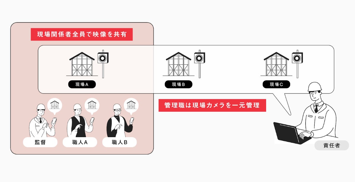 これらの問題は、「コネクトカメラ」の映像を監督以外の設計、営業、職人、施主と関係者全員に共有することで解決してきましたが、アプリのインストールや100名以上のアカウント管理は工務店にとって大きなハードルとなっていました。