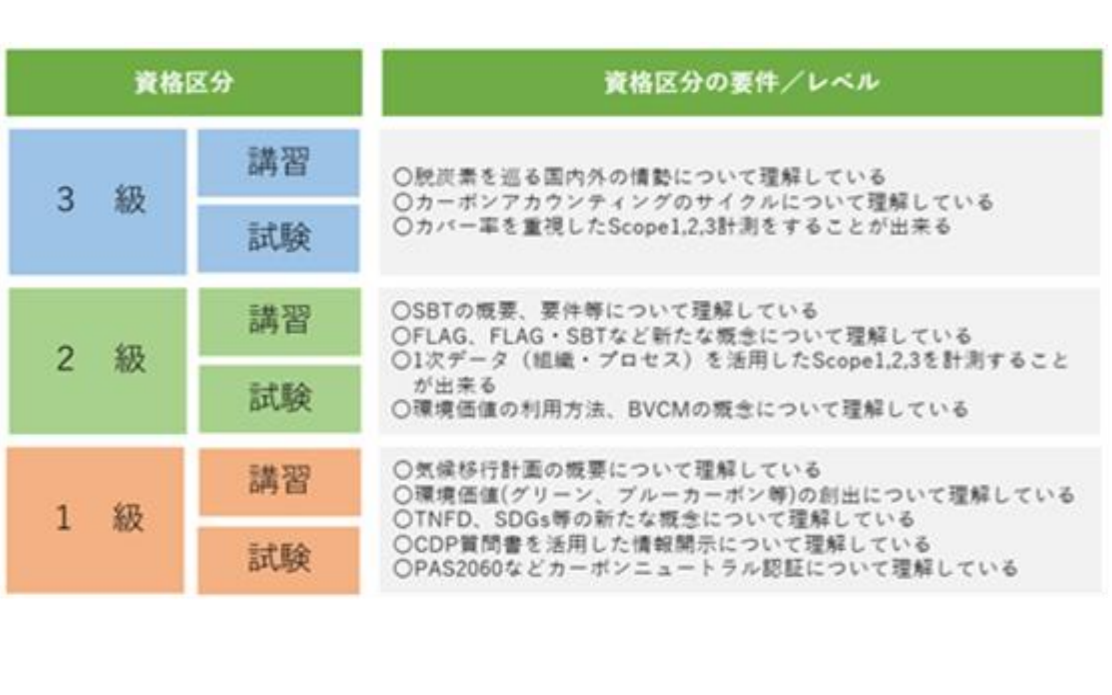 炭素会計アドバイザー資格は、国際ルールに則ったCO2排出量の算定や情報開示への対応ができる人材の育成を目指し創設された国内初の民間資格です。炭素会計をはじめとした気候変動関連業務に取り組むうえで、必要となる知識を体系的に習得いただくことを目指しており、難易度に応じて、3 級から1 級までの3資格区分としています。