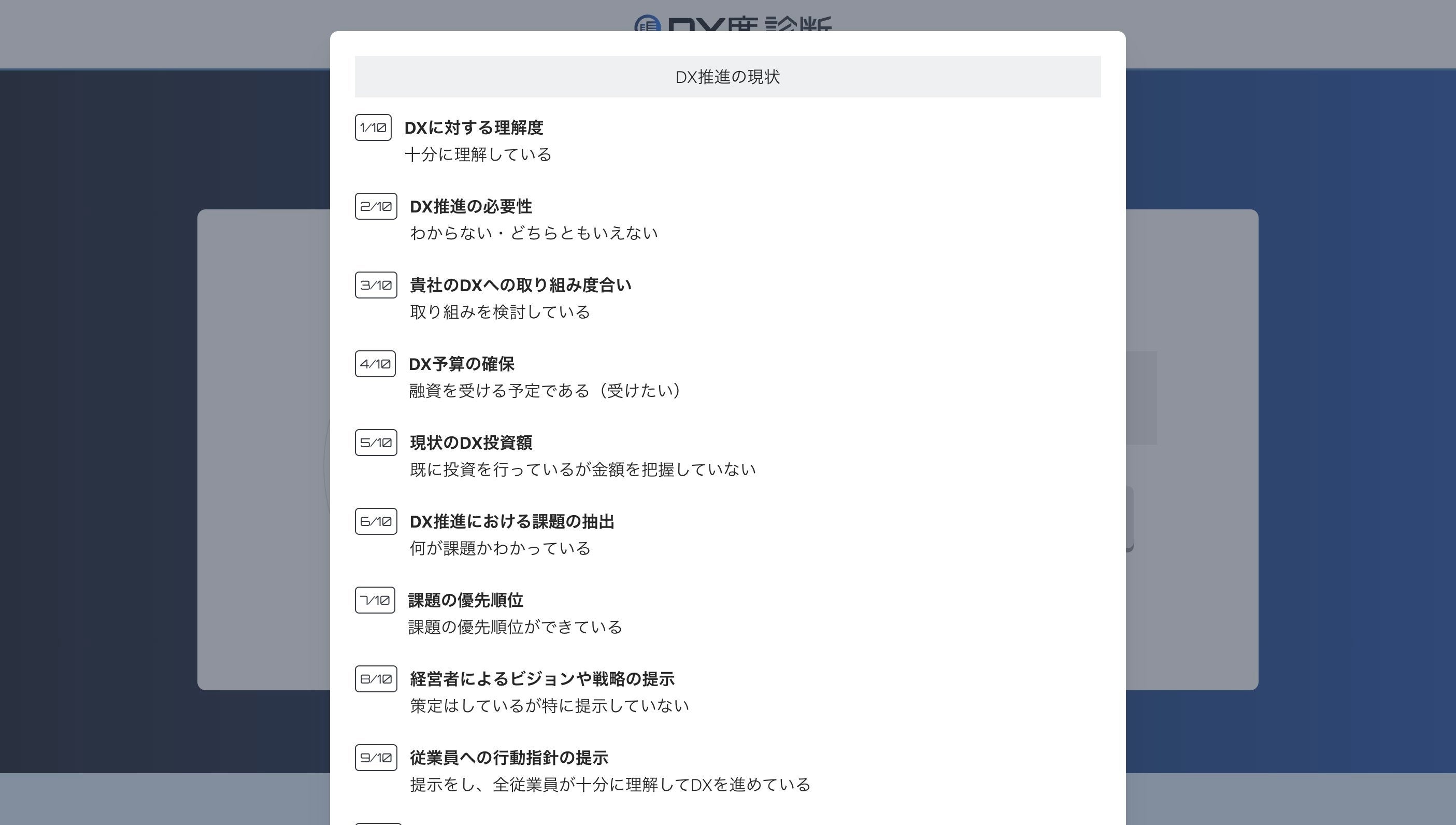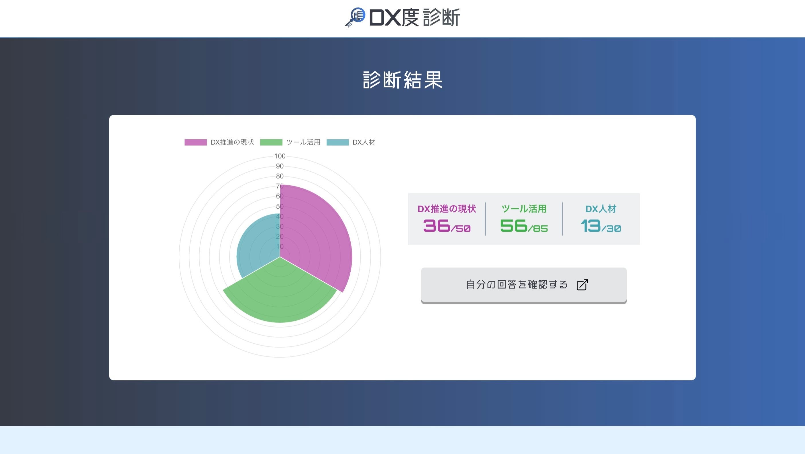 「DX度診断」では、自社のデジタル戦略、組織の柔軟性、データ活用能力、技術インフラなど、さまざまな側面にわたる診断を受けることができます。診断結果は簡潔かつわかりやすく提示され、企業はDXの推進や改善に向けたフィードバックを確認することができます。