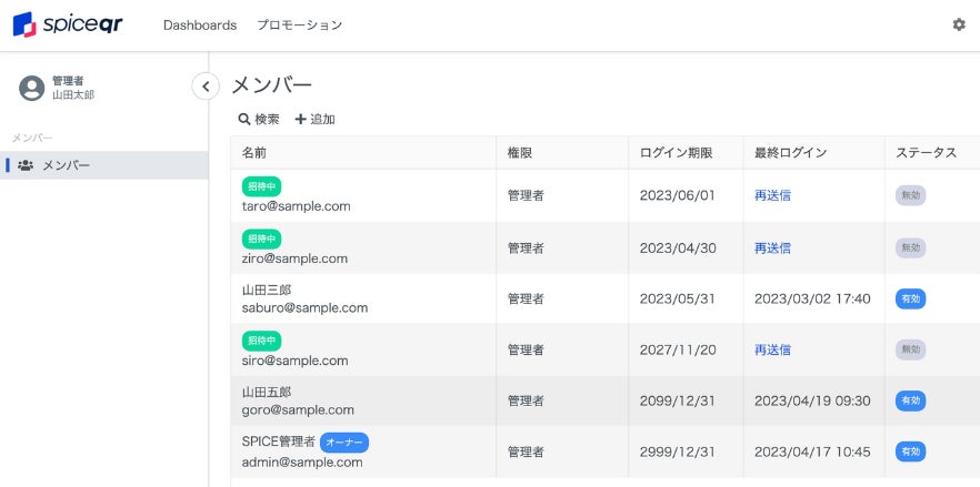 QRコードの管理は複数メンバーで行えます。アカウントごとの権限設定によって、たとえば外部パートナーにはダウンロード権限のみを与えるといったこともできます。これにより、内部チームと外部パートナーの間でのスムーズな協働が実現します。