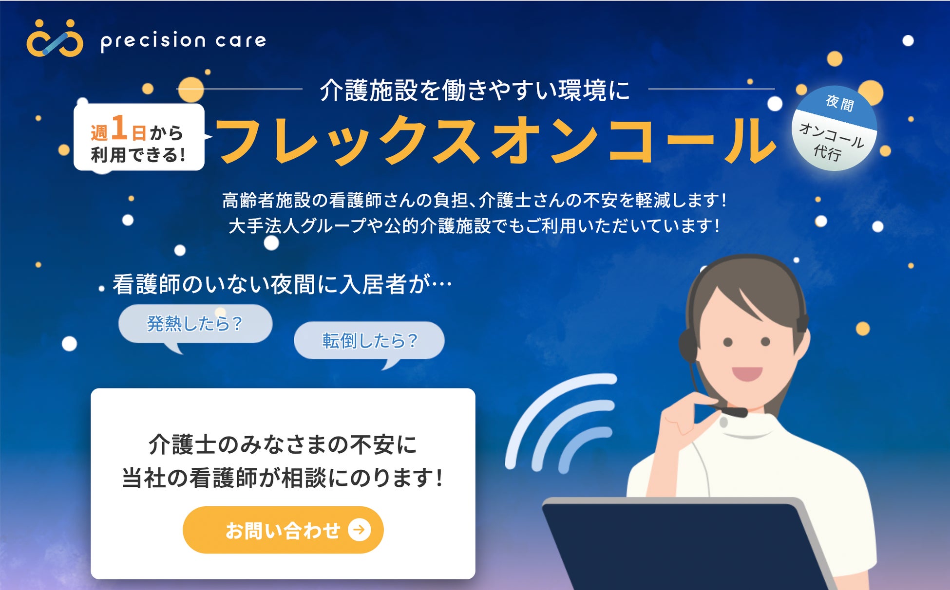 介護業務を⽀援する様々なサービスを開発・提供する株式会社プレシジョンケア(所在地:東京都渋⾕区、代表取締役:佐⽅信夫)はこのたび、介護施設様へのインタビューから⽣まれた、新サービス「フレックスオンコール」を開始いたしました。