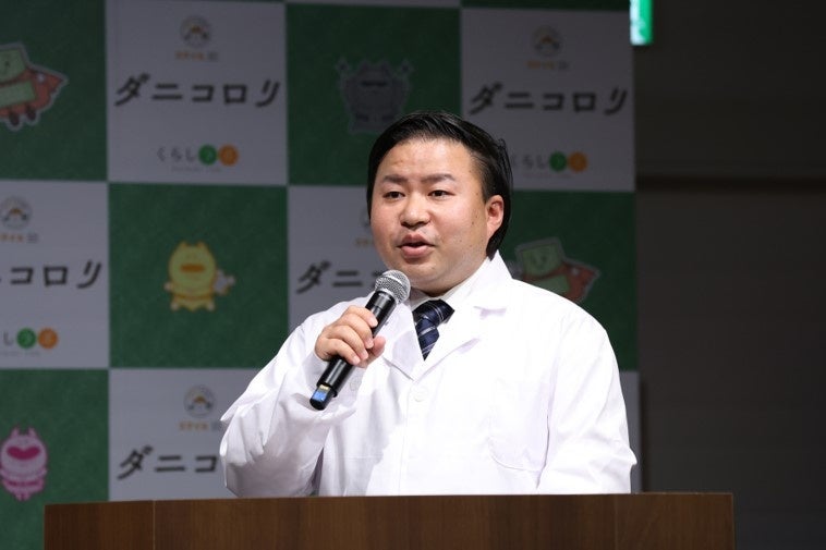 当日は、株式会社くらしラボ 商品企画・開発部 部長 河野行宏が登壇し、ダニ対策の必要性や弊害に関して説明しました。ダニは気温が20度~30度、湿度が60~80%の環境下になると増加することから、6月から爆発的に増加し、8月頃にピークに達するため、これからの季節はより注意が必要になること、さらに、天日干しや掃除機かけだけでは不十分かつ労力がかかるため、ダニ取りシートなどダニ対策製品が大切であると語りました。
