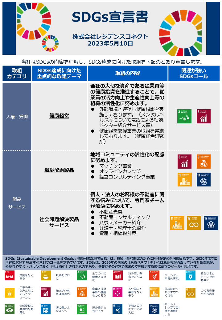 この度株式会社レジデンスコネクトは株式会社七⼗七銀⾏のSDGs⽀援サービスにより⾃社の強みと課題を再認識するとともに、SDGs達成へ向けた取り組みを宣⾔いたしました。