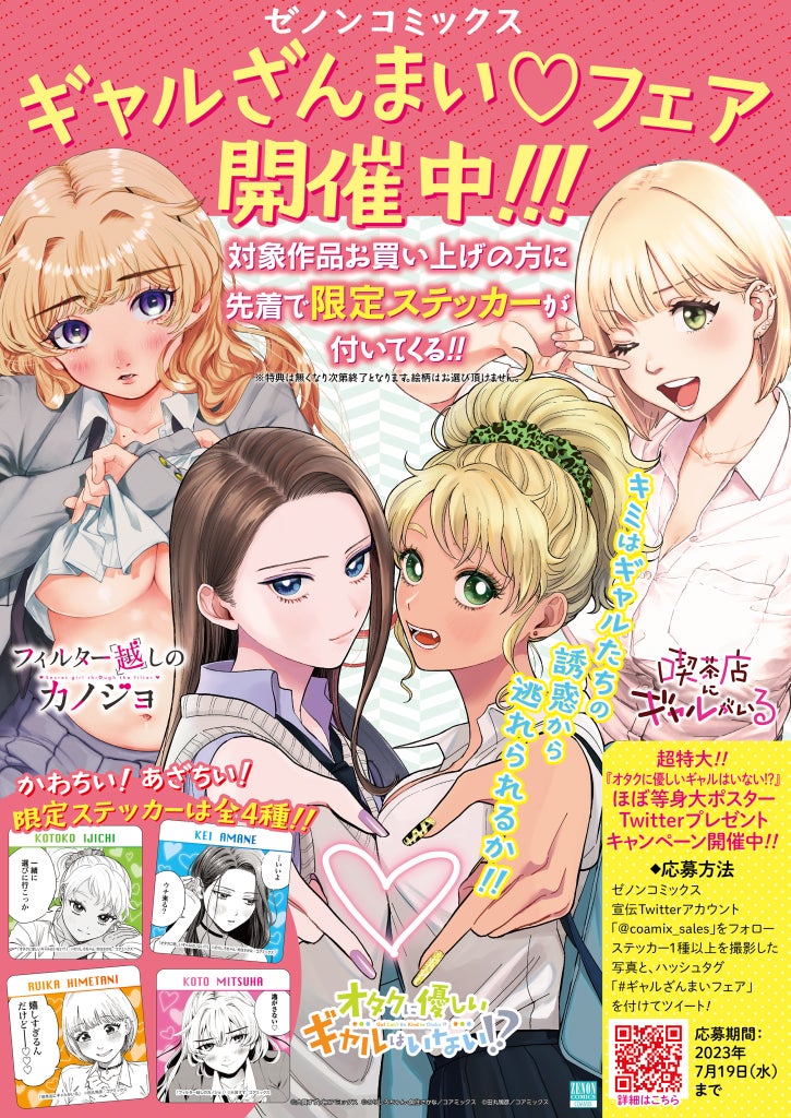 6月20日発売ゼノンコミックス『オタクに優しいギャルはいない!?』『フィルター越しのカノジョ』『喫茶店にギャルがいる』新刊or既刊をお買い上げの方に限定ステッカーをプレゼント!