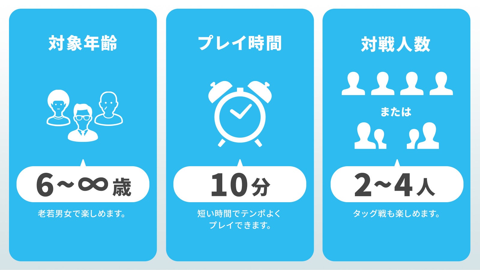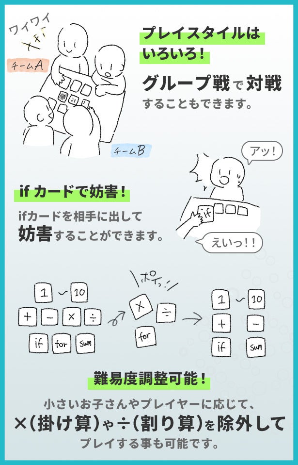 6歳くらいの足し算引き算ができるお子様から老若男女幅広く一緒に楽しむ事ができ、プログラミング的思考を身につけるだけではなく、脳トレとしても楽しんでもらう事ができるカードゲームです。