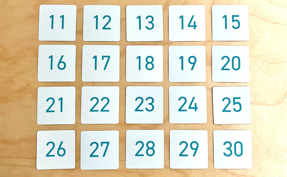 ◉計算カードをよくシャッフルし、各プレイヤーに7枚ずつ配ります。残りは山としてふせて中央においておきます。