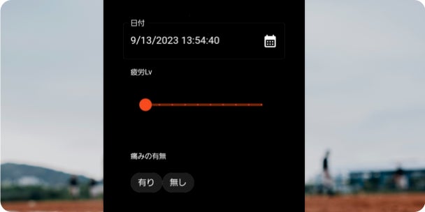 一日の投球数や日々の疲労度や痛みの有無/箇所、痛みの度合いなどを記録できます。