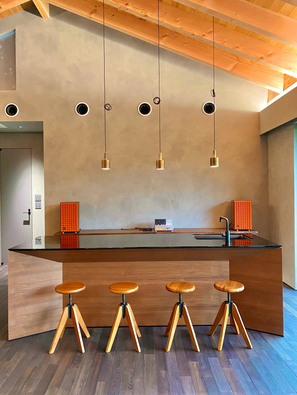 モダンでスタイリッシュな伝統的な木製の梁で空間に温かみを与え、あえて斜めに設置し、天井の高さや開放感のある空間を演出。