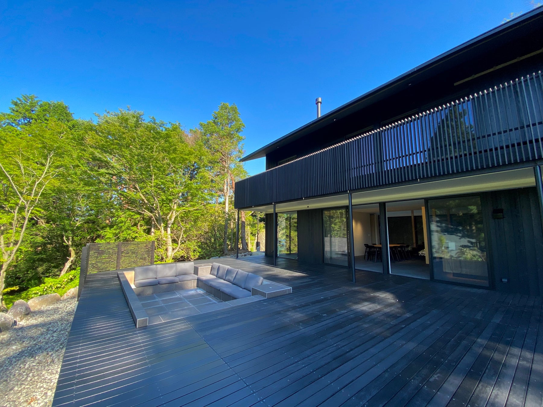 「本物に囲まれた、もう一つのプライベート空間」約200平米の屋内、外には約100平米のウッドテラスそして源泉掛け流し温泉が楽しめる一棟貸施設「MONSGORA」