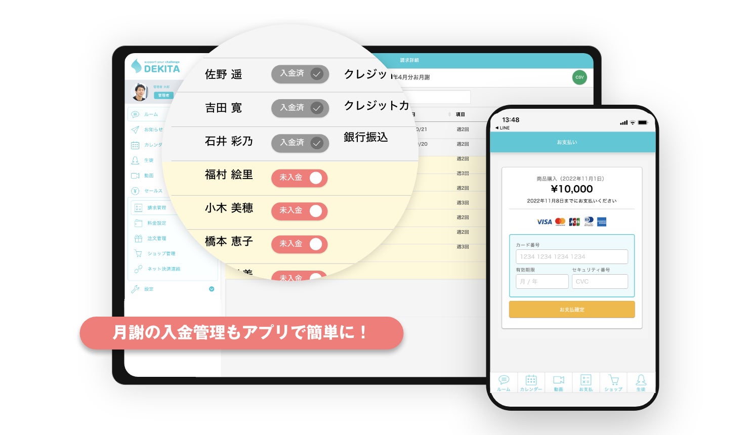 できた!DEKITAを導入頂いたユーザー様の多くは、システム導入を機にネット決済を導入して頂いております。新型コロナウイルス感染症の流行以降、キャッシュレス決済が一般化し、手軽に利用できるようになったことが、大きな要因ですが、これまでよりも、早く、簡単にネット決済を開始できることが、利用者が増えている理由です。