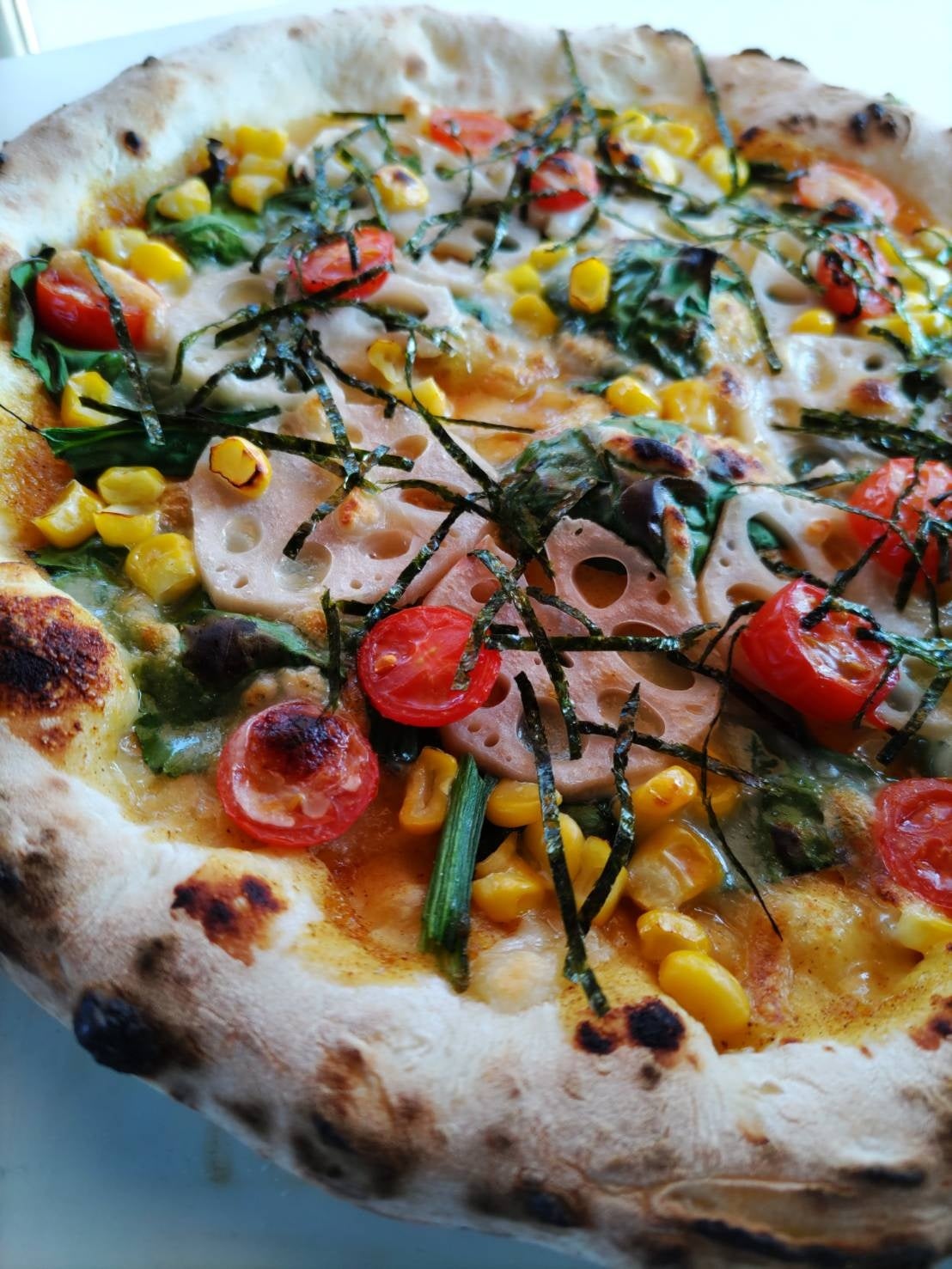 佐賀県の美味しさが詰まったピザ 生地:県産小麦「はる風ふわり」、加唐島産「一の塩」、「椿油」 トッピング:県産野菜(れんこん、海苔、トマト、ほうれん草)